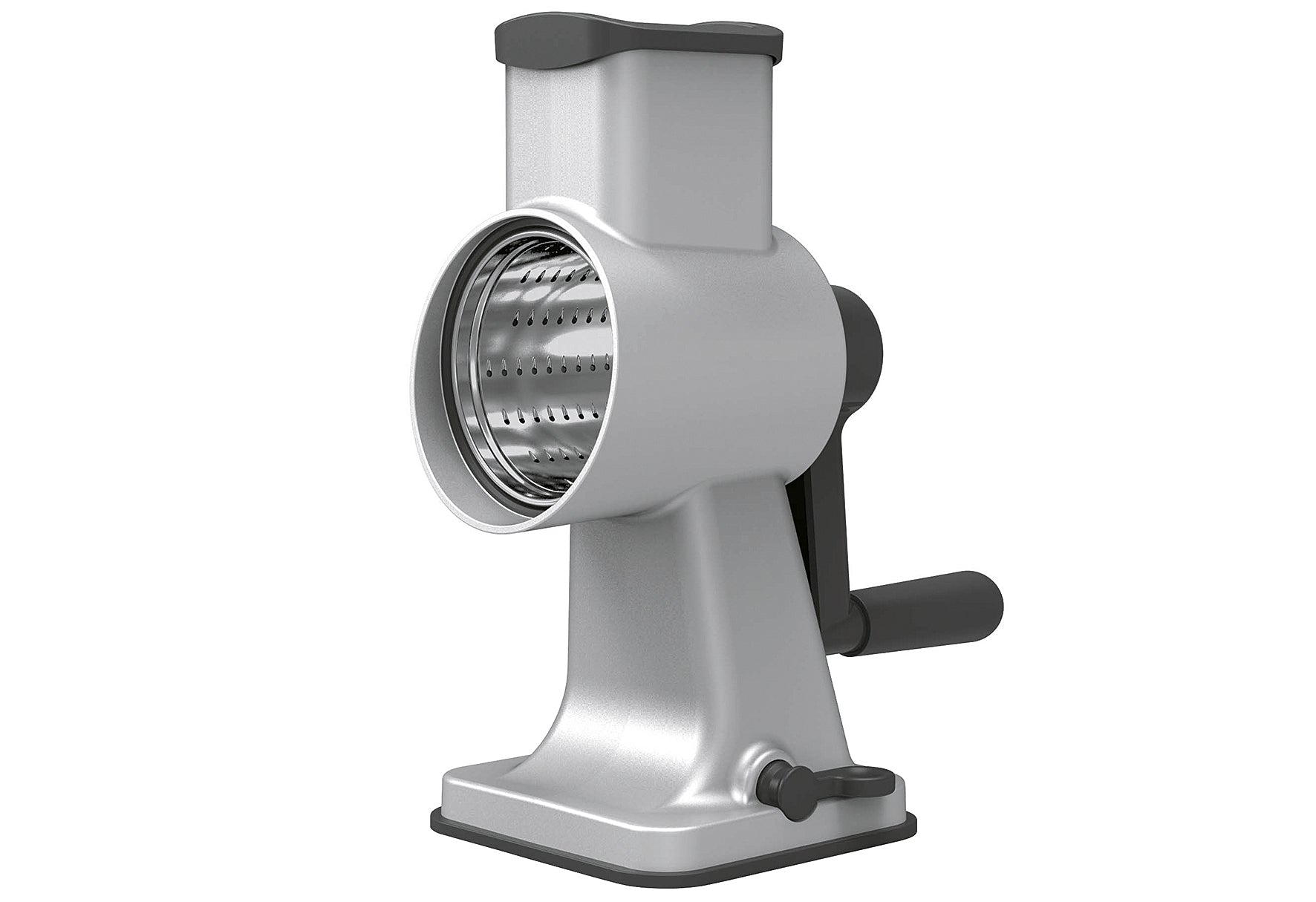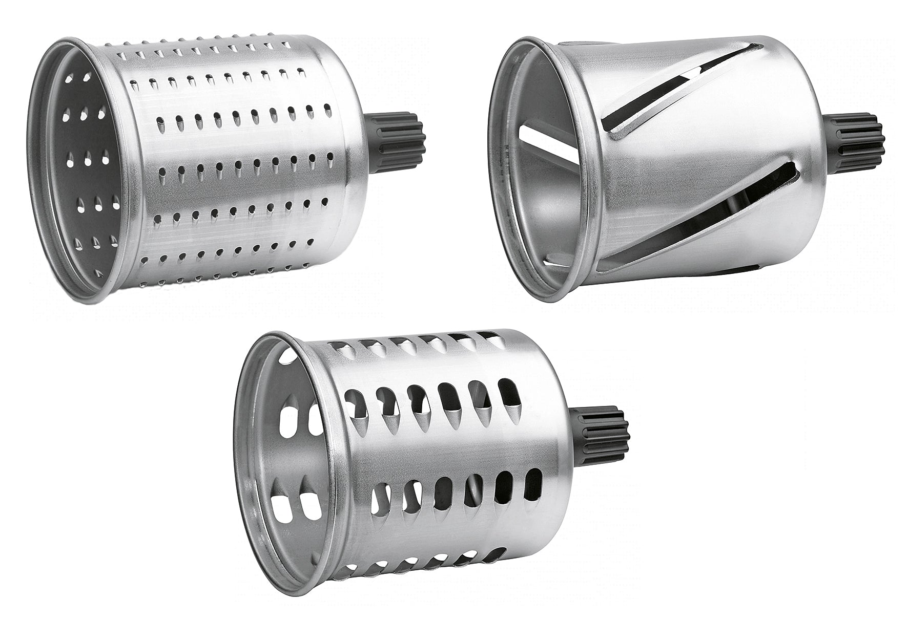 inkl. Scheiben- , Fein- und Grobreibetrommel, Gehäuse aus beschichtetem Aluminium, scharfe Klingen für ein gleichmäßiges Ergebnis, starker Vakuum-Saugfuß, ruhige und gleichmäßige Laufleistung