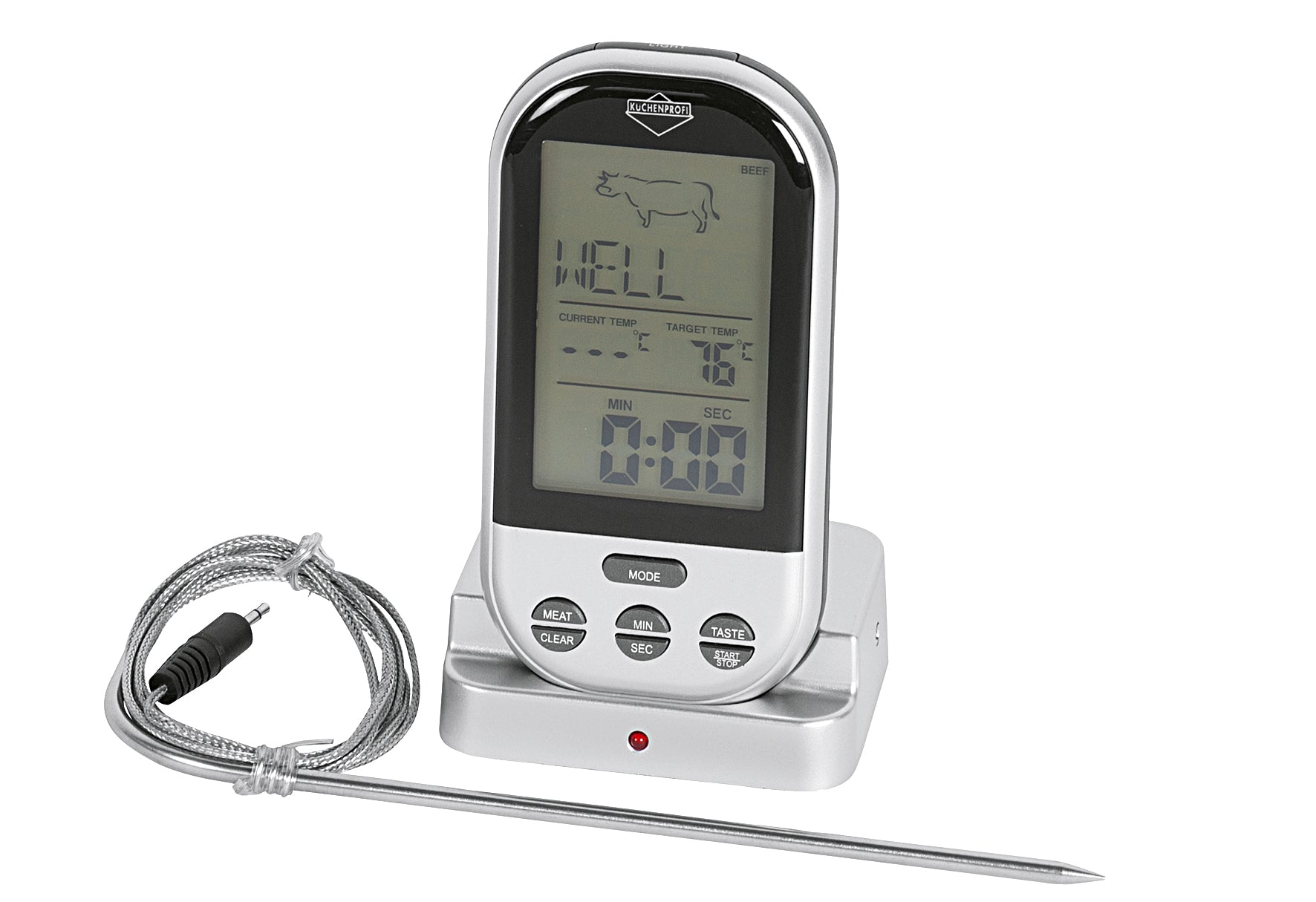 - Kunststoff / Edelstahl, digital, mit Funkübertragung, Alarmfunktion bei gewünschter Temperatur, Timer / Stoppuhr, tragbarer Empfänger mit Befestigungsklipp, Reichweite bis 30 m, beleuchtetes Display, misst bis 250°C, umschaltbar zwischen °C / °F, inkl. 4 Batterien, 2 Jahre Garantie, in Geschenkverpackung, Thermometer inkl. Lade-, bzw. Empfängerstation besteht aus Kunststoff, Temperaturfühler ist aus Edelstahl