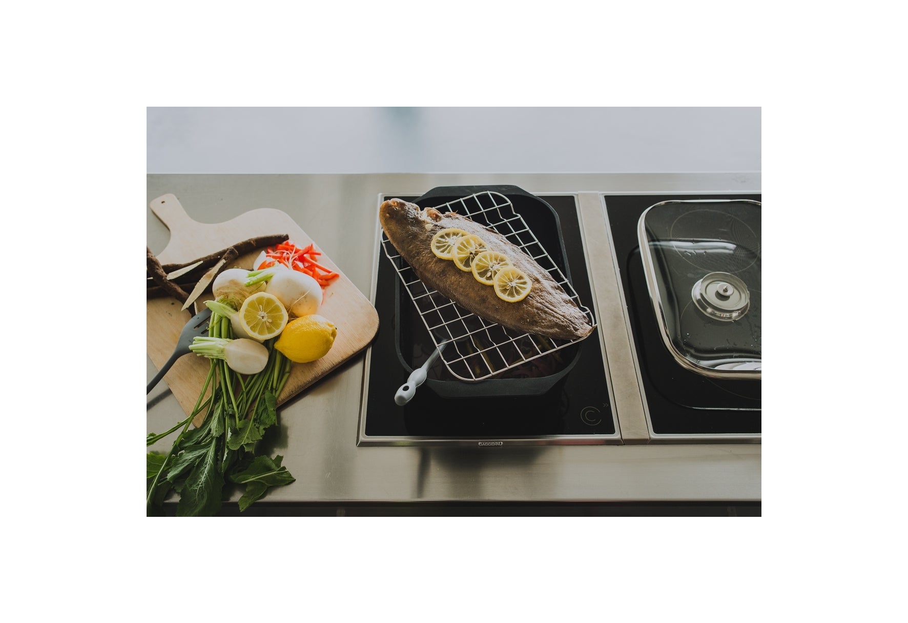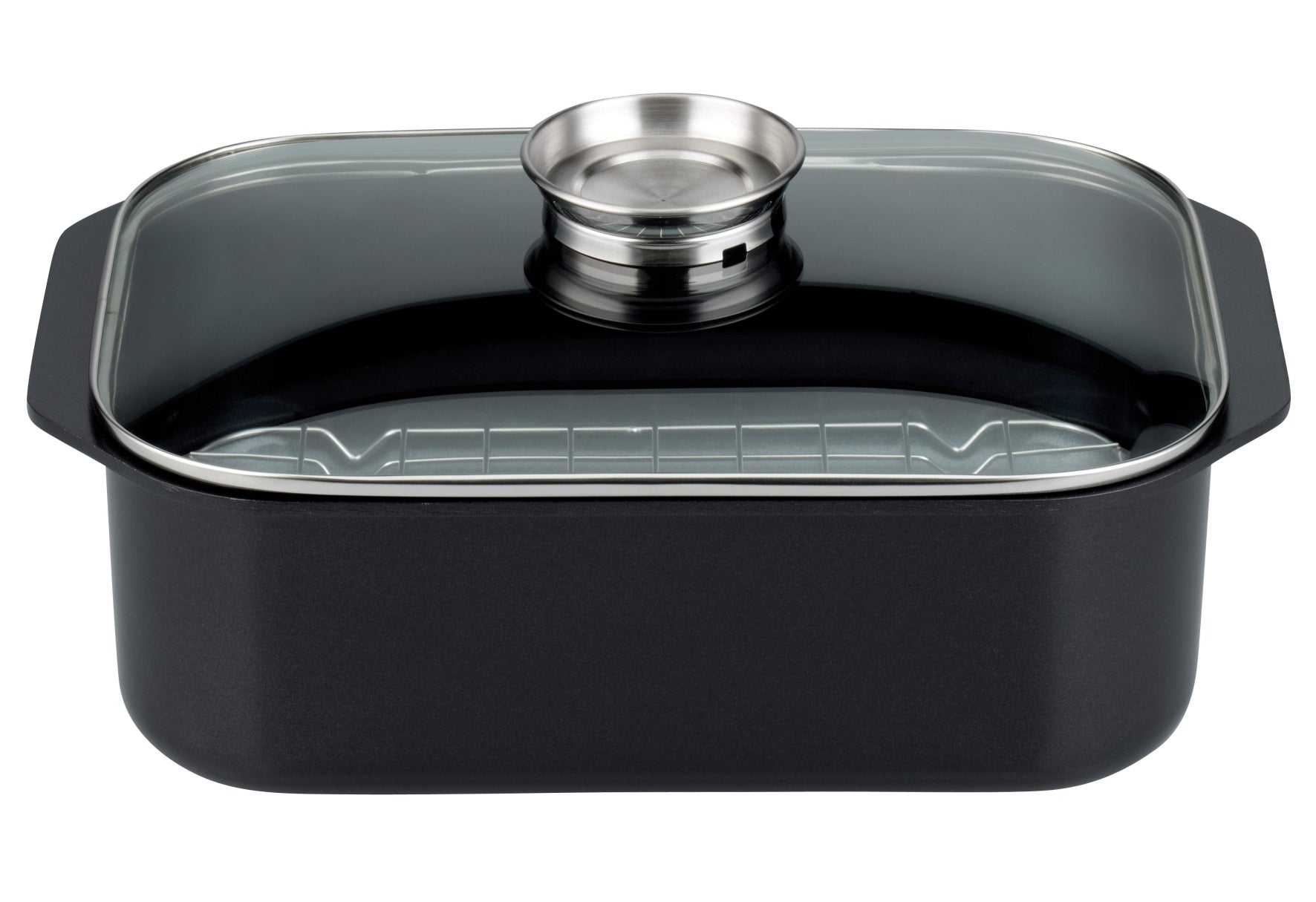 Aluminium Druckguss, innen langlebige kratzfeste Antihaftversiegelung Thermoceramika, PTFE-frei, außen schwarz Silicon beschichtet, Wandstärke ca. 2,2 cm, Bodenstärke ca. 5 mm, Glasdeckel mit stoßfestem Edelstahlrand, mit Edelstahl Grillrost, backofenfest mit Deckel bis 180°C, ohne Deckel bis 240°C, für alle Herdarten inkl. Induktion geeignet 8 l, (LxB): 40x25 cm