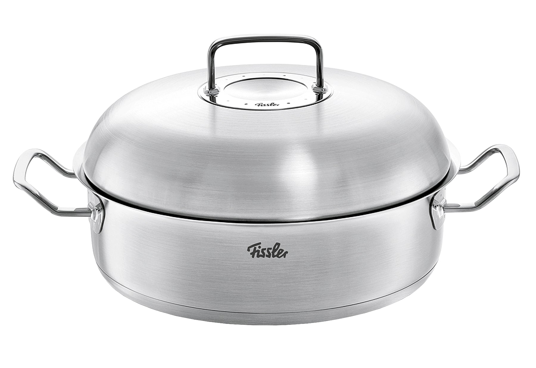 Edelstahl 18/10, satiniert, für saftiges Gargut: Metalldeckel mit Wölbung, damit der Dampf nach unten tropft, breiter Schüttrand, integrierte Messskala, Kaltmetallgriffe, spülmaschinengeeignet, Cookstar® Allherdboden, für alle Herdarten inklusive Induktion geeignet, backofengeeignet bis 230 °C Ø 28 cm