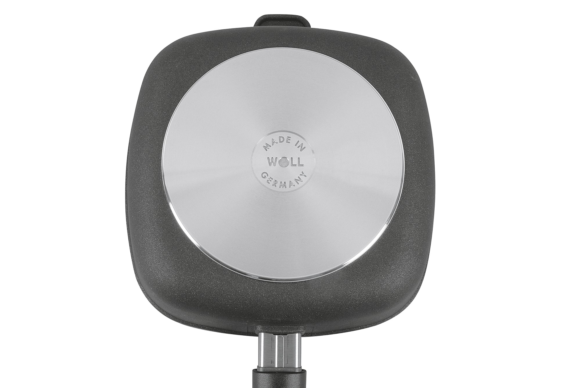 - Aluguss, schnitt- und abriebfeste Titanium-Hartgrundversiegelung, ca. 8 mm gegossener Thermoboden für optimale Wärmespeicherung, bis 250°C backofenfest, mit abnehmbarem Stiel, nicht induktionsgeeignet