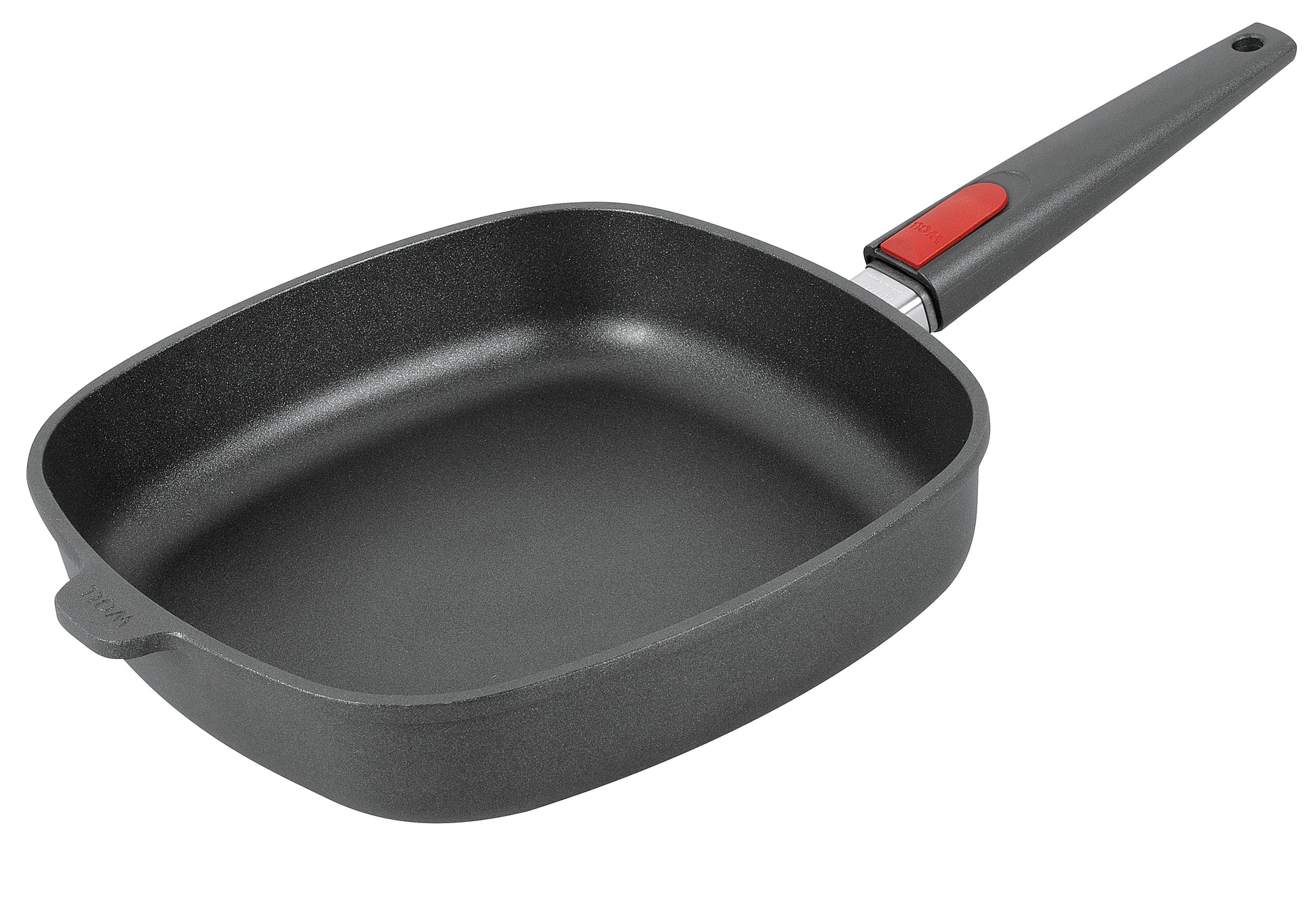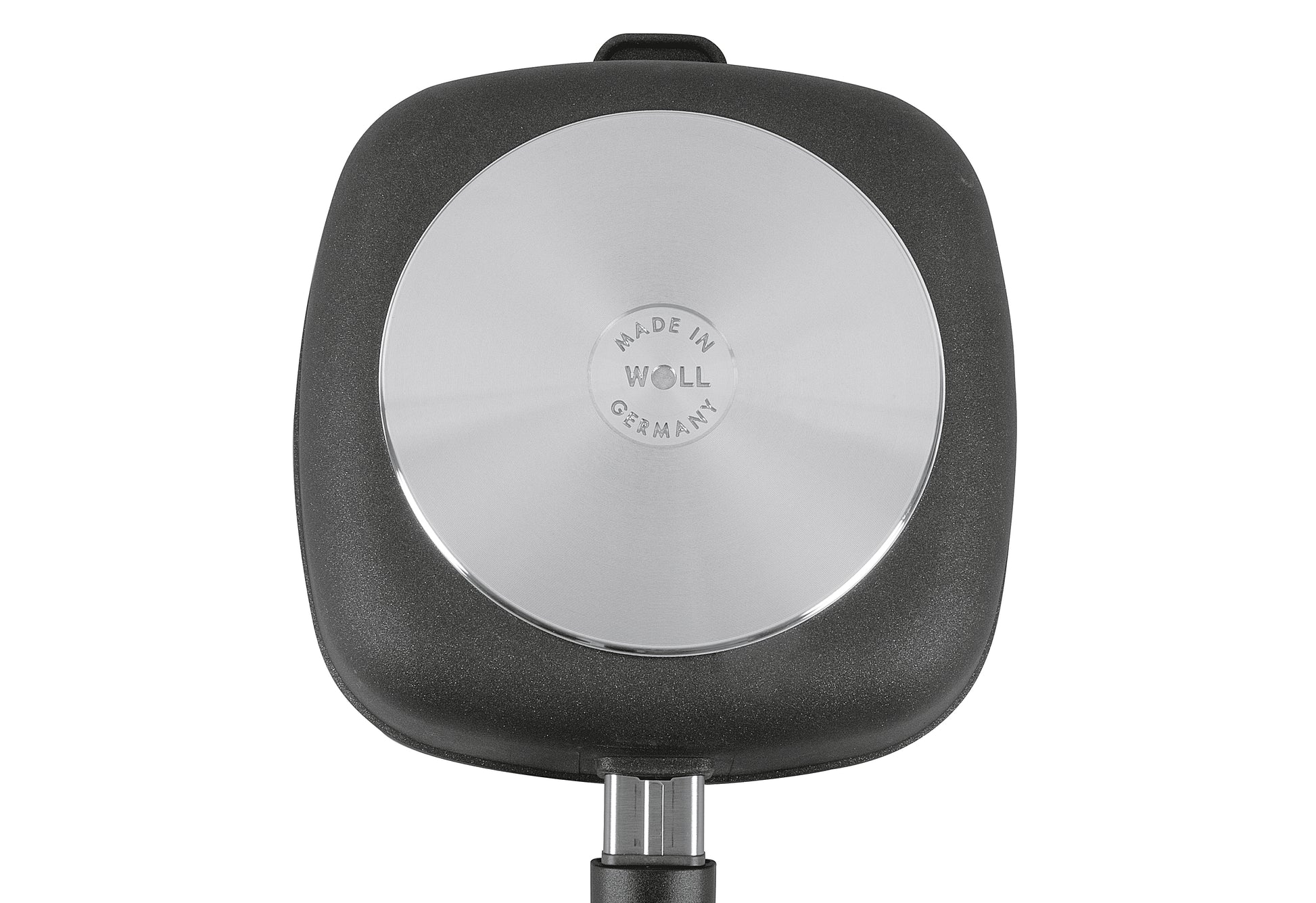 - Aluguss, schnitt- und abriebfeste Titanium-Hartgrundversiegelung, ca. 8 mm gegossener Thermoboden für optimale Wärmespeicherung, bis 250°C backofenfest, mit abnehmbarem Stiel, nicht induktionsgeeignet