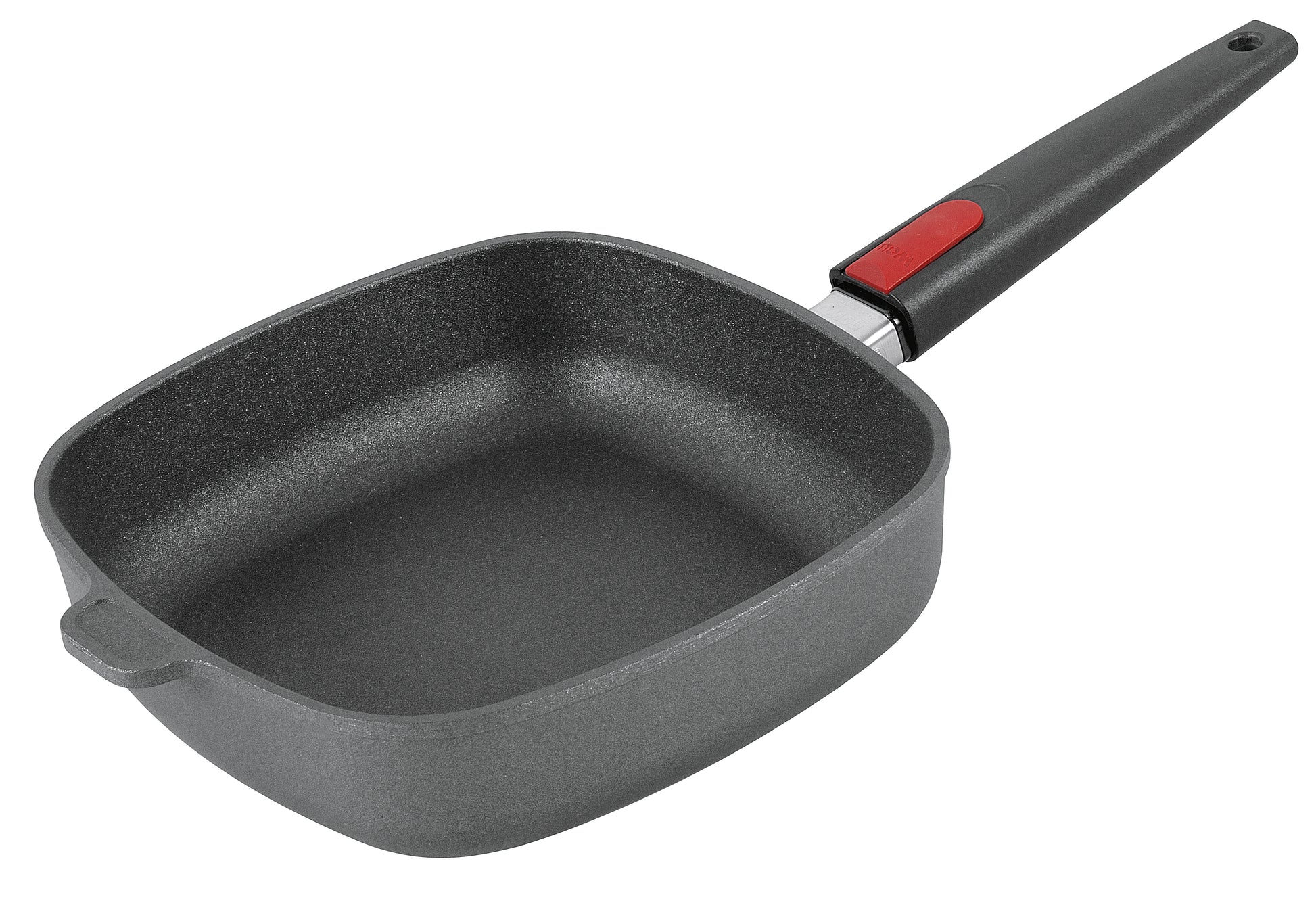 - Aluguss, ohne Deckel, ca. 8 mm gegossener Thermoboden für optimale Wärmespeicherung, schnitt- und abriebfeste Titanium-Hartgrundversiegelung, mit abnehmbarem Stiel, backofenfest bis 250° C, hohe Stoßfestigkeit, verstärkter Schüttrand, spülmaschinengeeignet, für alle Herdarten inkl. Induktion geeignet