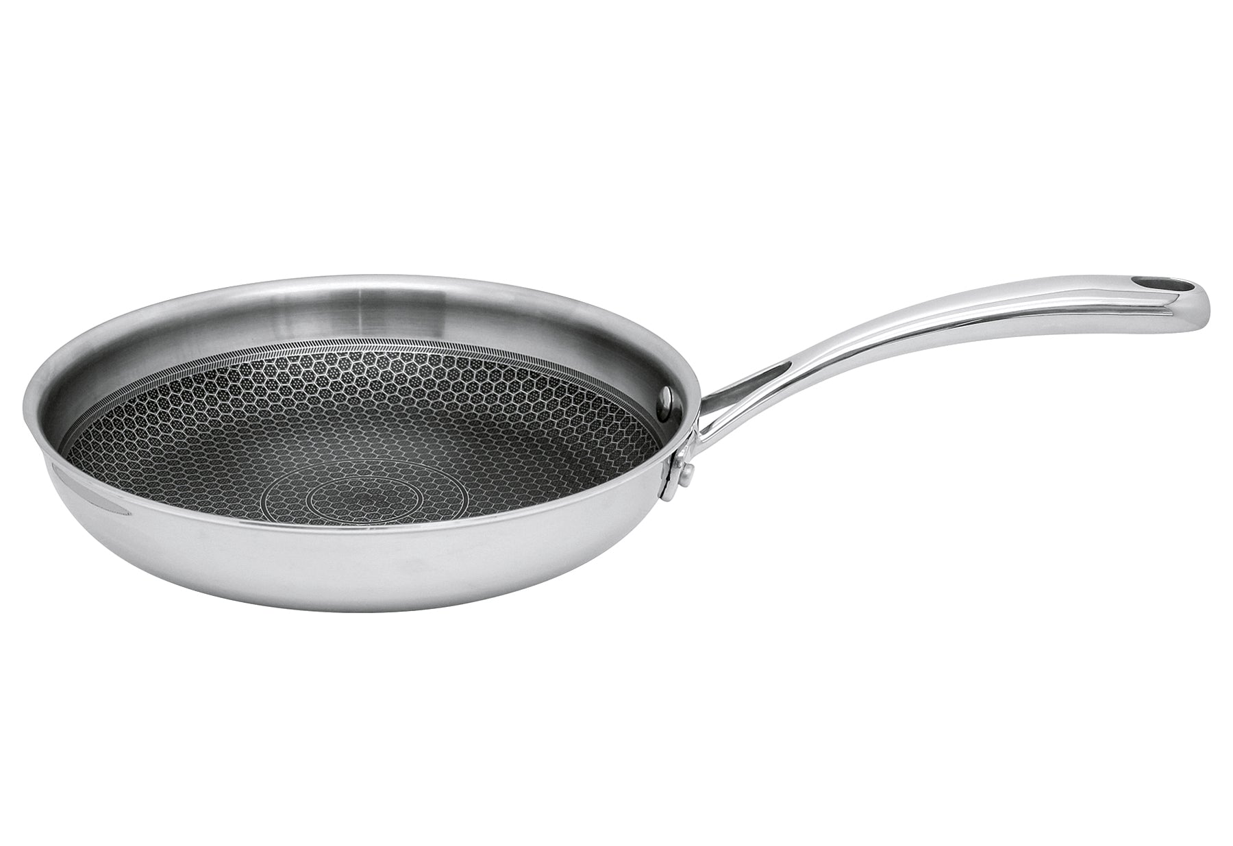 Edelstahl 18/8 -18/10, durchgehender Aluminium-Kern, außen magnetischer Edelstahl, hochglanzpoliert, Wabenboden, Antihaftversiegelung, kratzfest, gleichmäßige Wärmeverteilung vom Boden bis zum Rand, Öl-Dosiersystem (Oil Optimizer), für den fettarmen, fettfreien Einsatz, reinigungsfreundlich, backofenfest bis 240 °C, für alle Herdarten geeignet Ø 24 cm, H 5,5 cm