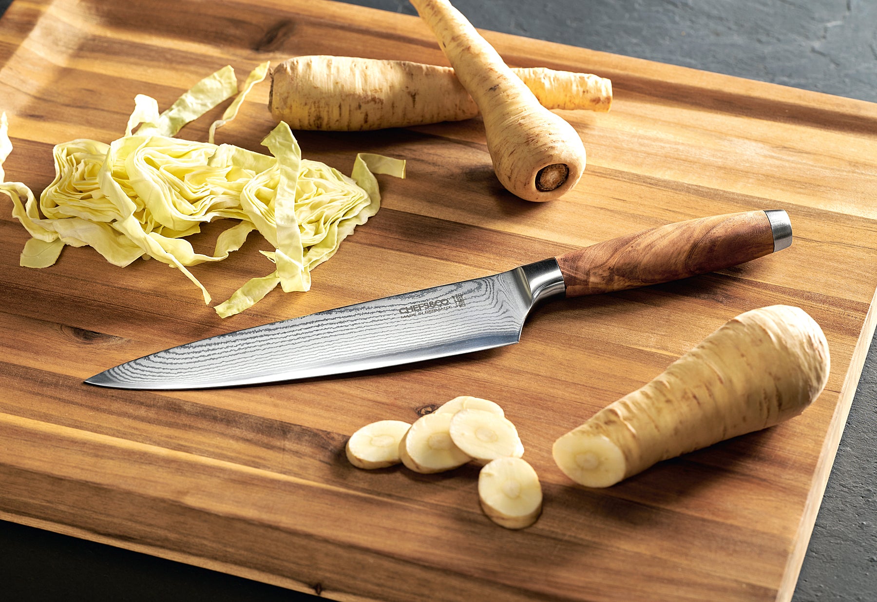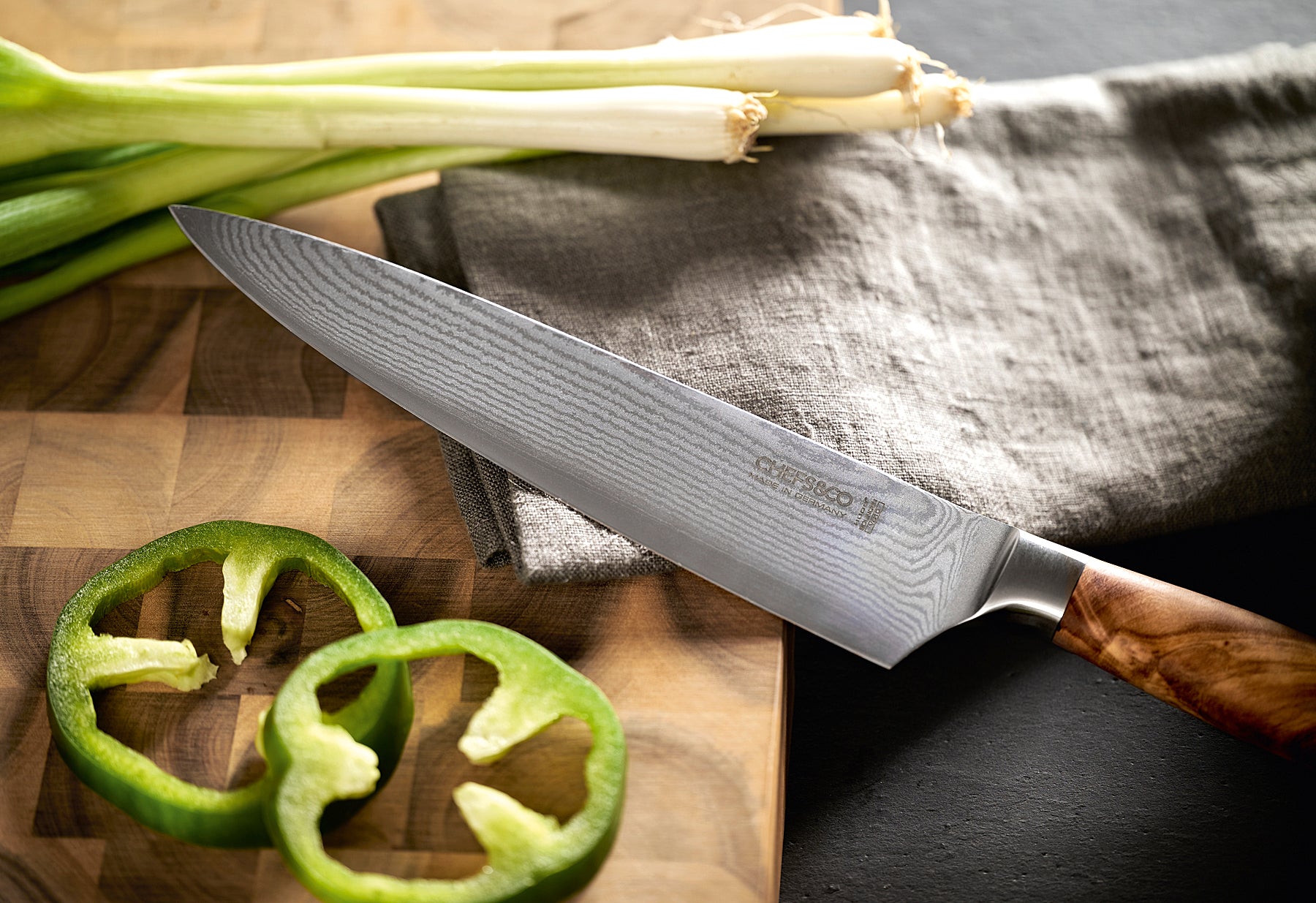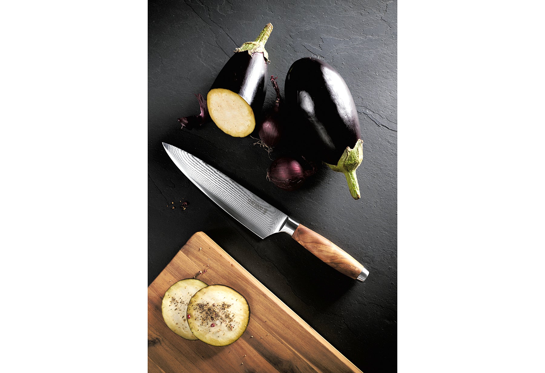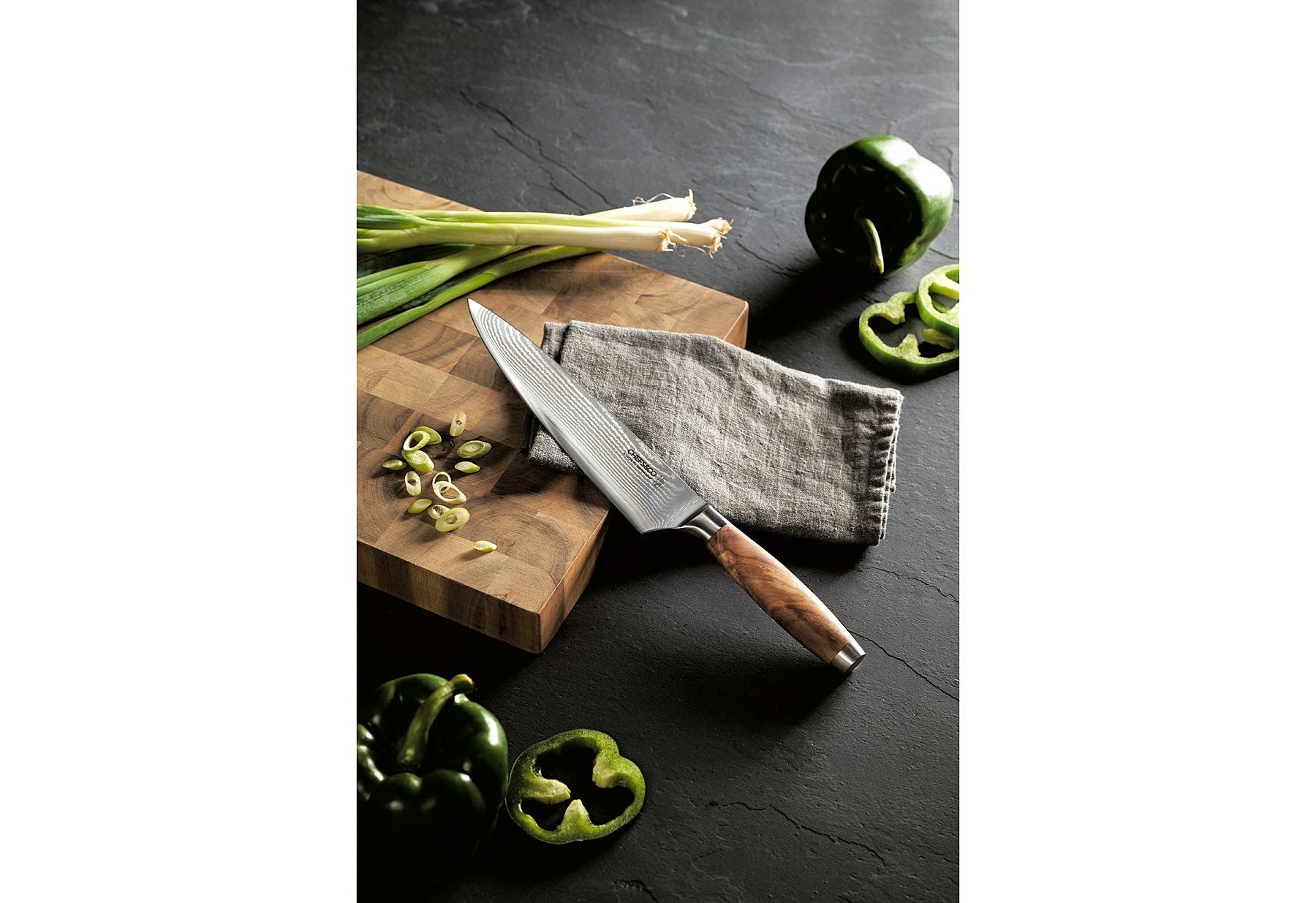 - hochwertiger 65-lagiger Damaststahl (VG 10), formschöner ergonomischer Doppelkropfgriff mit hochwertigen Olivenholz und Edelstahlkröpfen verleihen dem Messer eine angenehme Ausgewogenheit und ermöglichen ein leichtes, sicheres Führen des Messers, in hochwertiger Geschenkbox Klingenlänge 20 cm