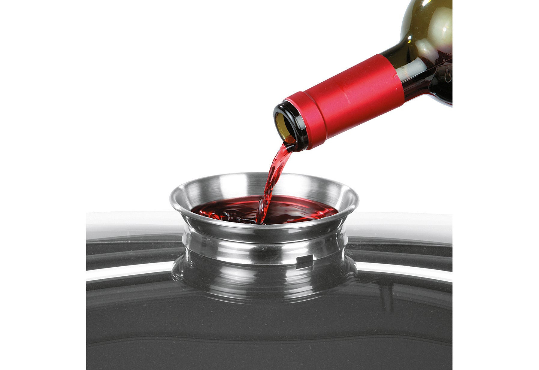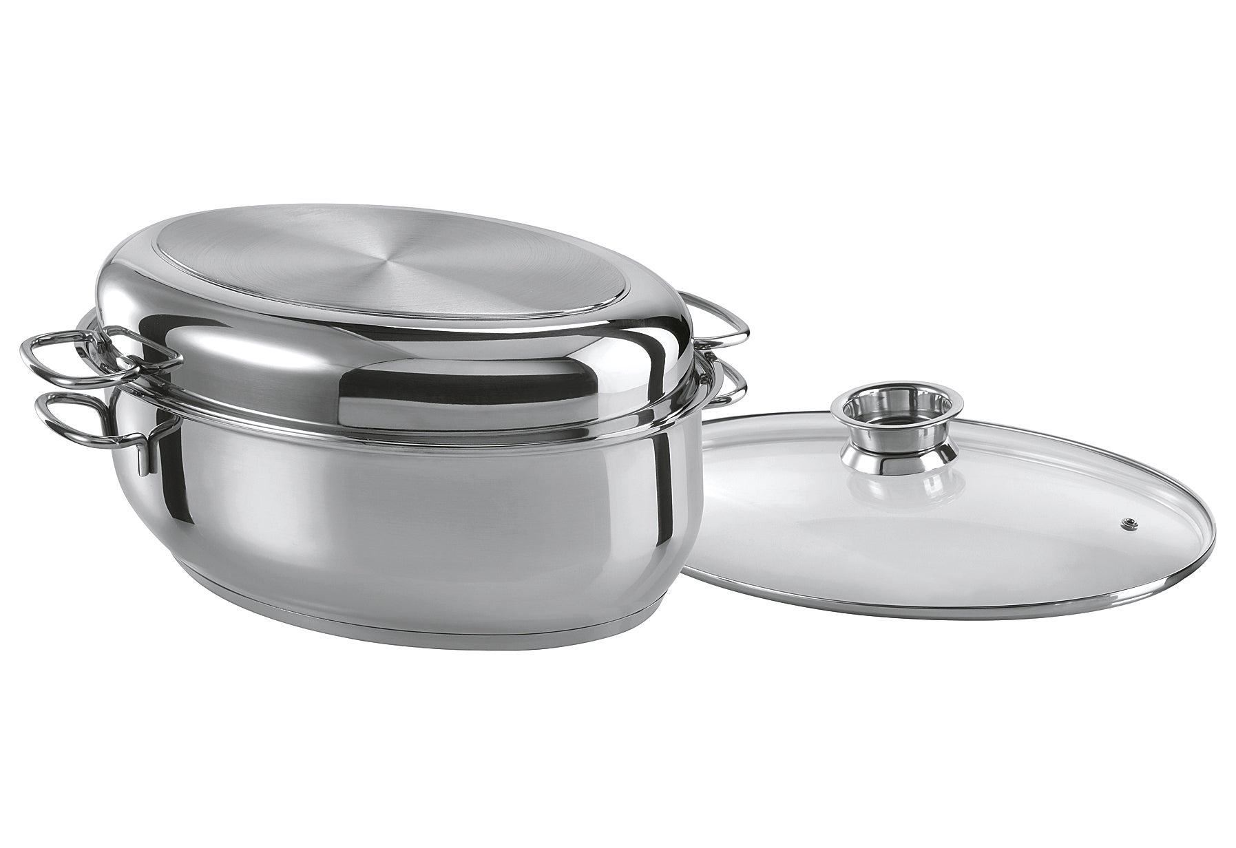 - Edelstahl rostfrei 18/8, Materialstärke: 0,8 mm, Edelstahldeckel mit Thermo-Kapselboden ca. 3 mm – ernergiesparend, auch einzeln verwendbar, Glasdeckel ist mit Aromaknopf - zum Beträufeln des Bratgutes mit z.B. Wein