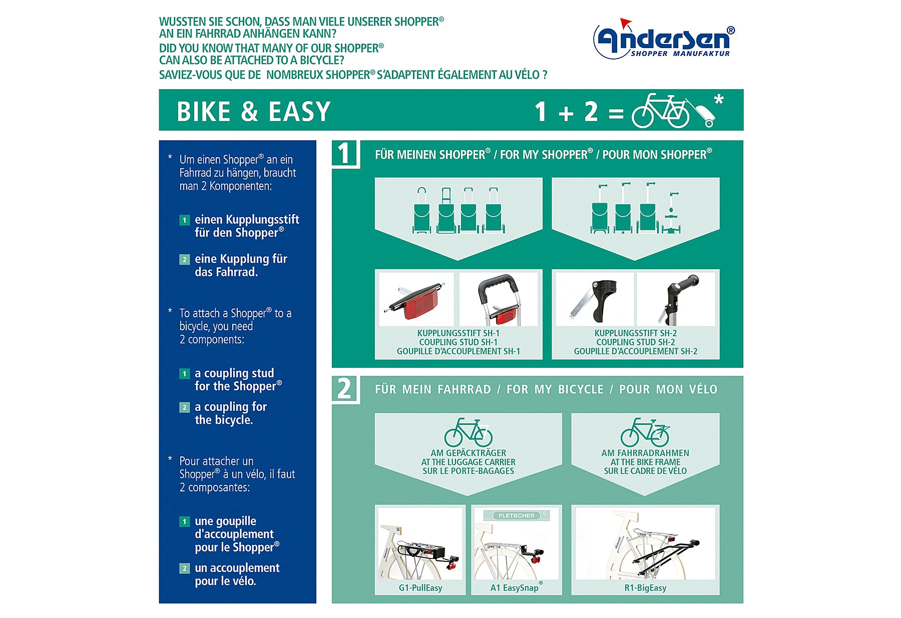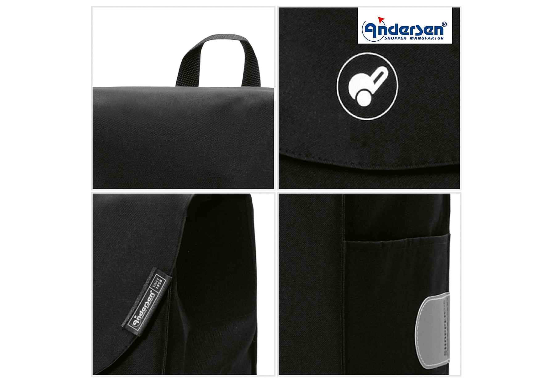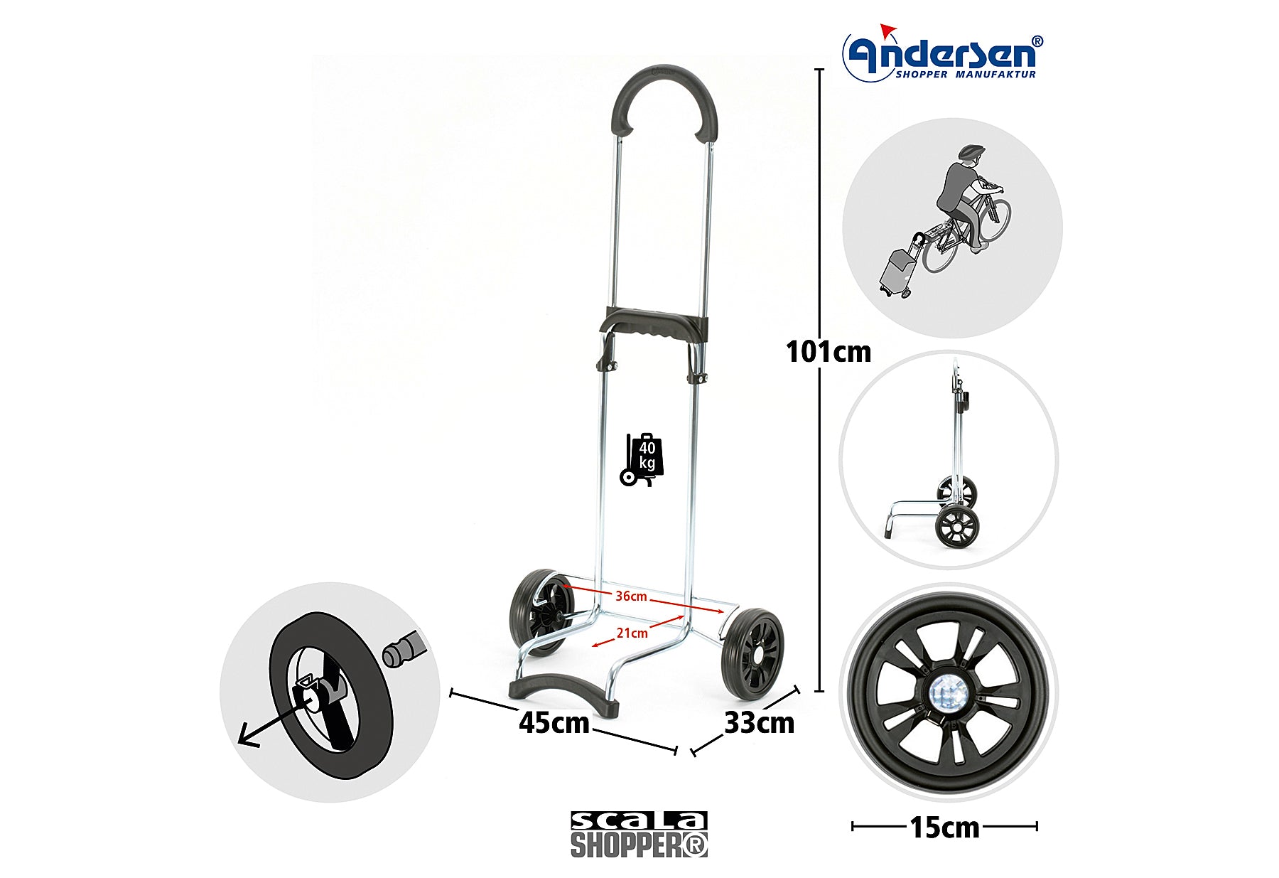 - chromatisiertes Stahlrohrgestell, faltbarer Griff, als Fahrradanhänger einsetzbar, Räder leicht abnehmbar, Leichtlaufräder, Spurbreite 45 cm, Raddurchmesser 15 cm, Fahrgestell Höhe 101 cm, Gewicht Fahrgestell 1,8 kg, Fahrgestelltragkraft 40 kg, Tasche: Reflektoren, Seitentasche, Innentasche, wasserabweisend, Tasche leicht abnehmbar, (BxHxT): 35x57x22 cm, Gewicht 0,8 kg