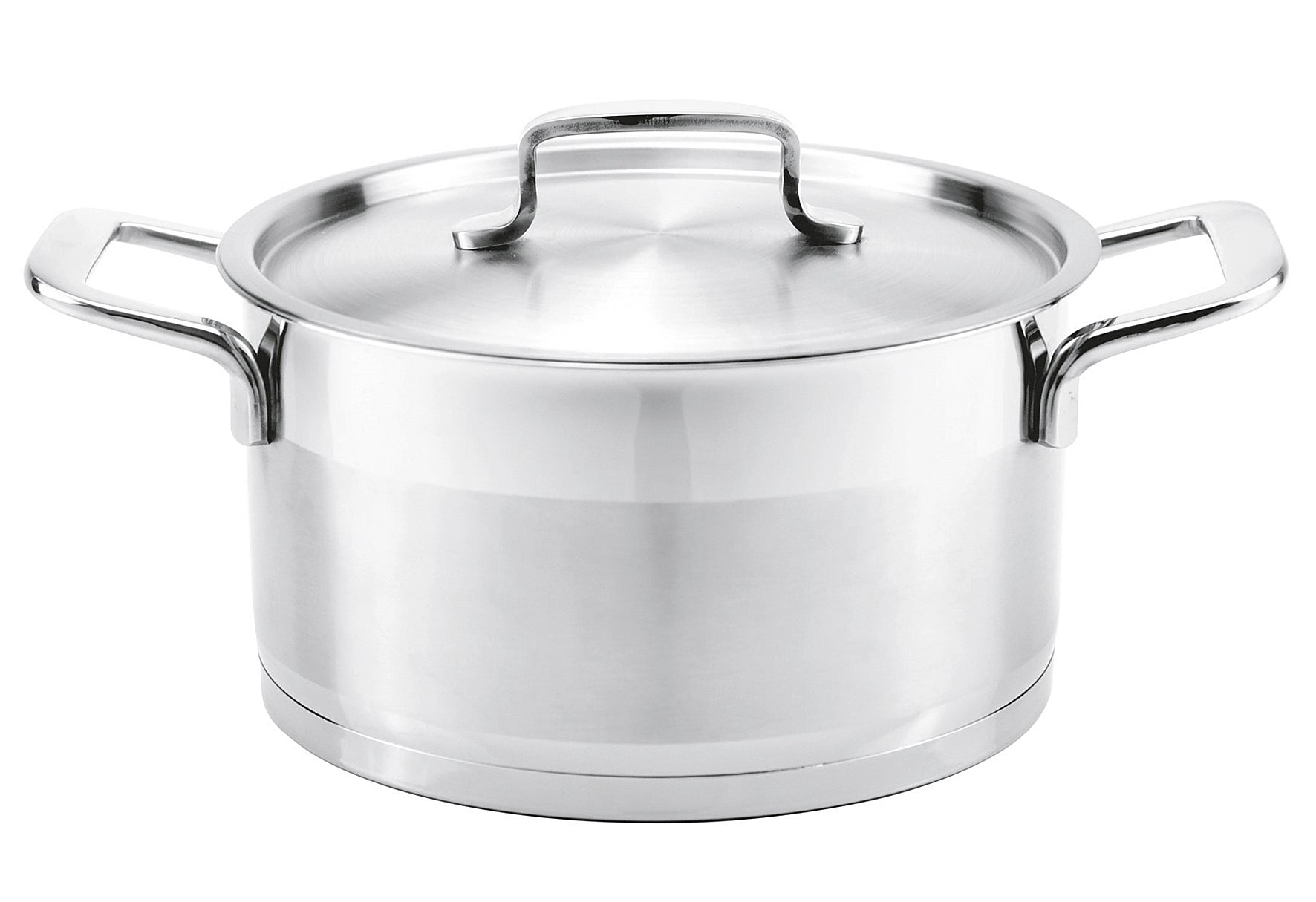 - Edelstahl 18/10, sehr gute Wärmeverteilung, Bodenstärke 5 mm, wärmeabweisender Kaltmetallgriff, innenliegende Literskala, innen glänzend, außen hochglanzpoliert mit satiniertem Dekorband, für alle Herdarten geeignet