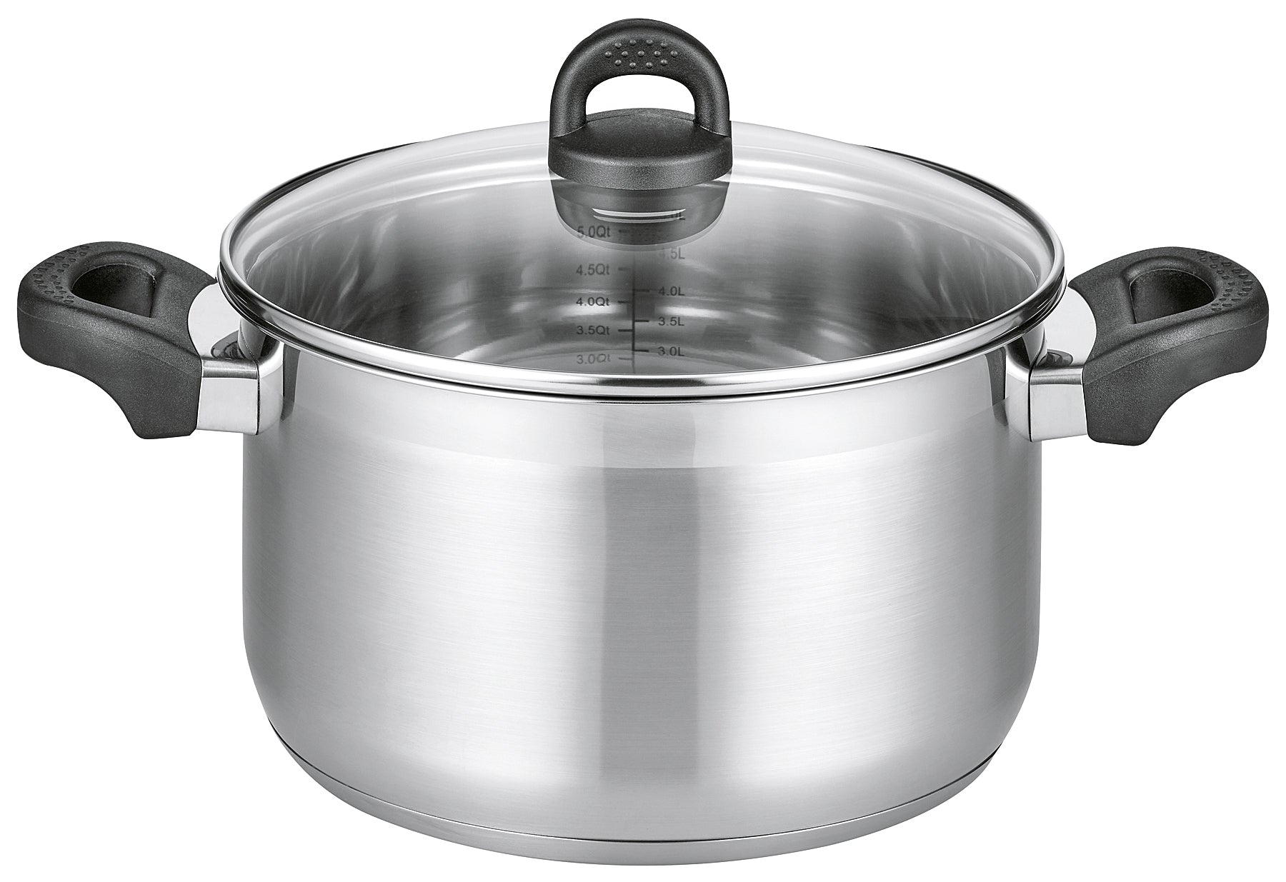Edelstahl 18/8 - 18/10, Wandstärke ca. 0,5 mm, Gesamtbodenstärke ca. 3,0 mm, Kapsel-Sandwich-Boden mit Aluminium-Kern, zylindrische Form mit Abgießrand, innen hochglanzpoliert, mit integrierter Volumenskala, mit integriertem Öl-Dosier-System, außen satiniert mit hochglanzpoliertem DeKo-Rand, rutschfeste schwarze Kunststoffgriffe mit Edelstahlflammenschutz, hochgewölbter Glasdeckel mit stoßfestem Edelstahlrand und Kunststoffknopf, mit Fingerschutzplatte, spülmaschinengeeignet, für alle Herdarten geeignet, auch für Induktion Ø 24 cm