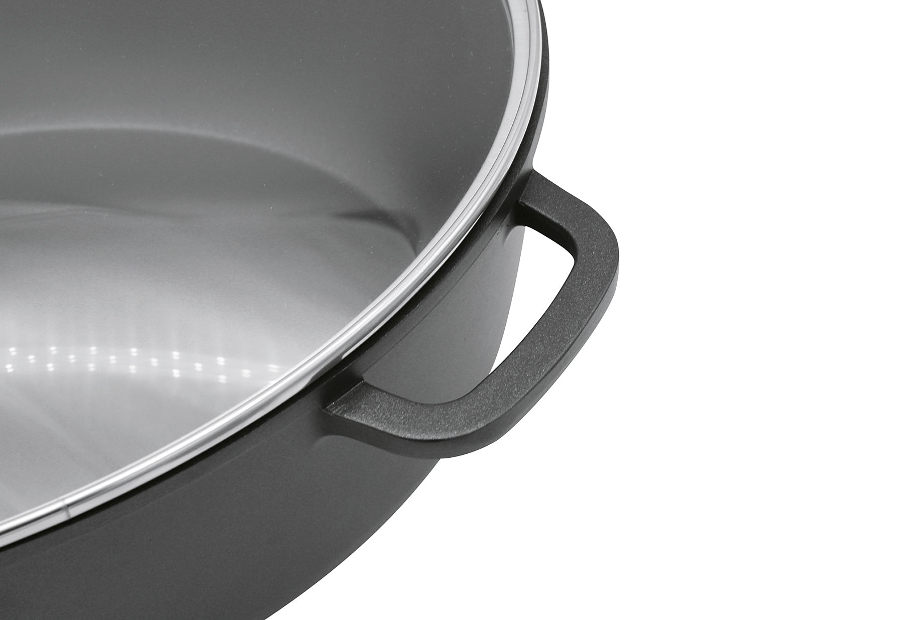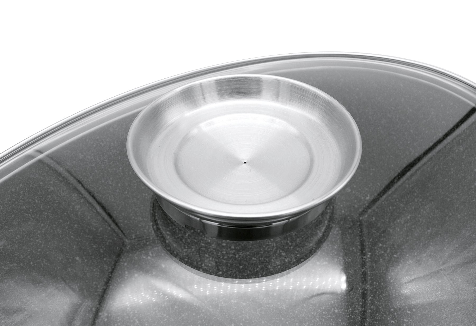 - mit Glasdeckel und Aromaknopf, Deckel bis 200°C backofenfest, inkl. 1 Paar Handschuhe (schwarz / weiß), schwere Qualitätsausführung, ca 2,2 mm Materialstärke, ca 5 mm Bodenstärke, mit Antihaft-Beschichtung, für alle Herdarten inkl. Induktion geeignet