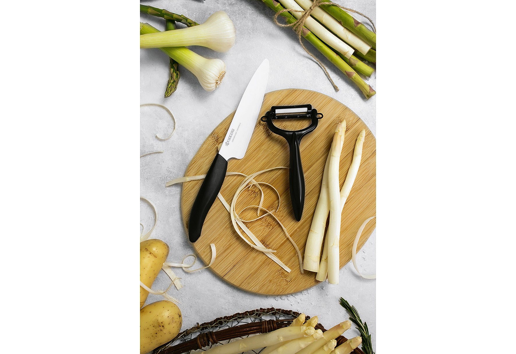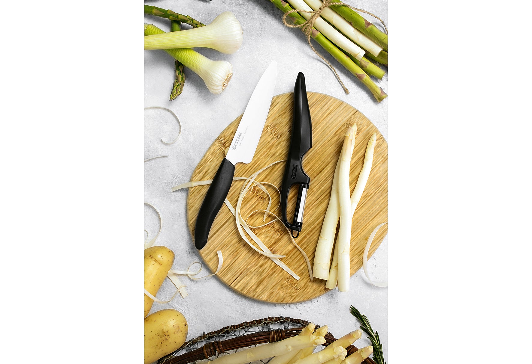- Kunststoff / Keramik, handgeschliffen, ergonomisch geformter Kunststoff-Griff, extrem scharf, ultraleicht, besonders bruchfest, Keramikklingen sind frei von Metall-Ionen und somit korrosionsfrei, die Klingen bleiben besonders lange scharf, daher ist Nachschleifen für lange Zeit nicht nötig, aber möglich, ob Obst, Gemüse, Salat oder knochenfreies Fleisch das Messer schneidet alle Zutaten mit besonderer Leichtigkeit, spülmaschinengeeignet, Klingenlänge: 13 cm