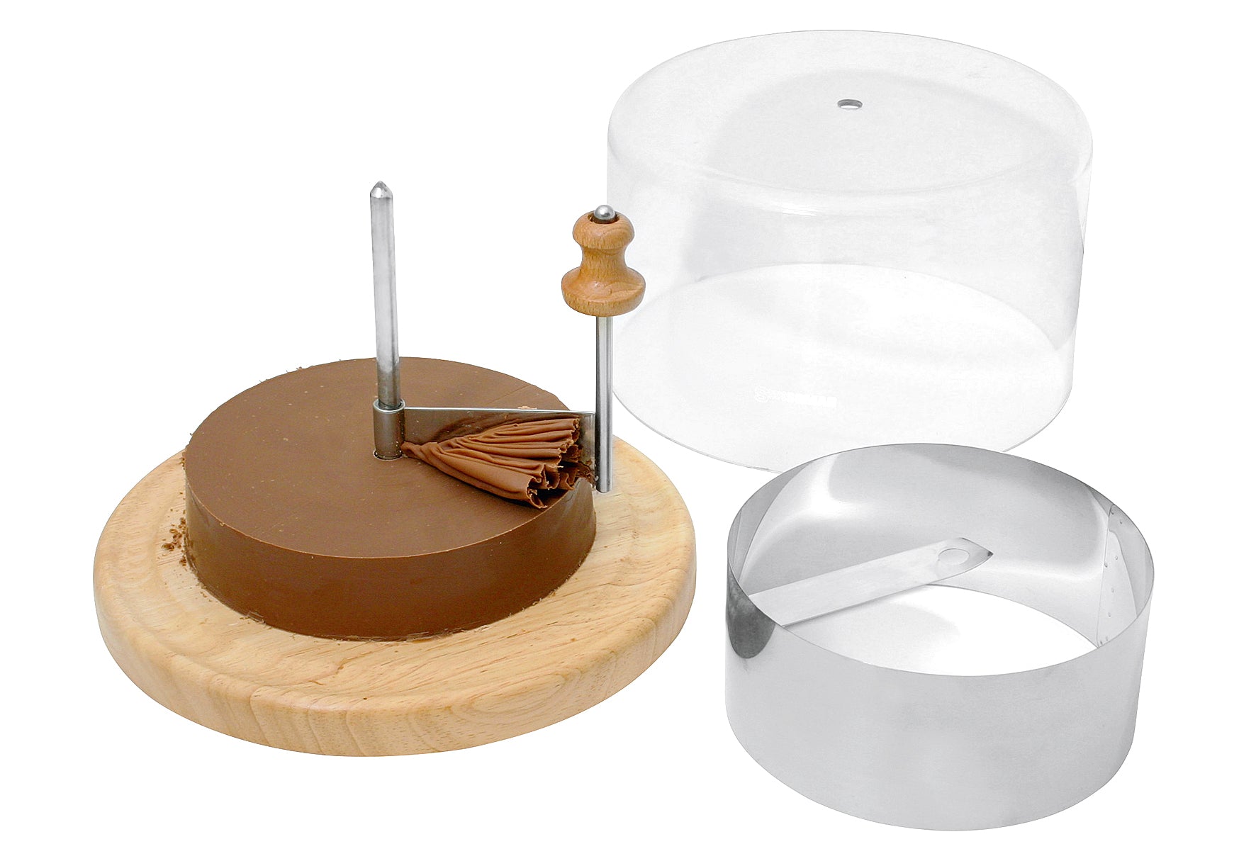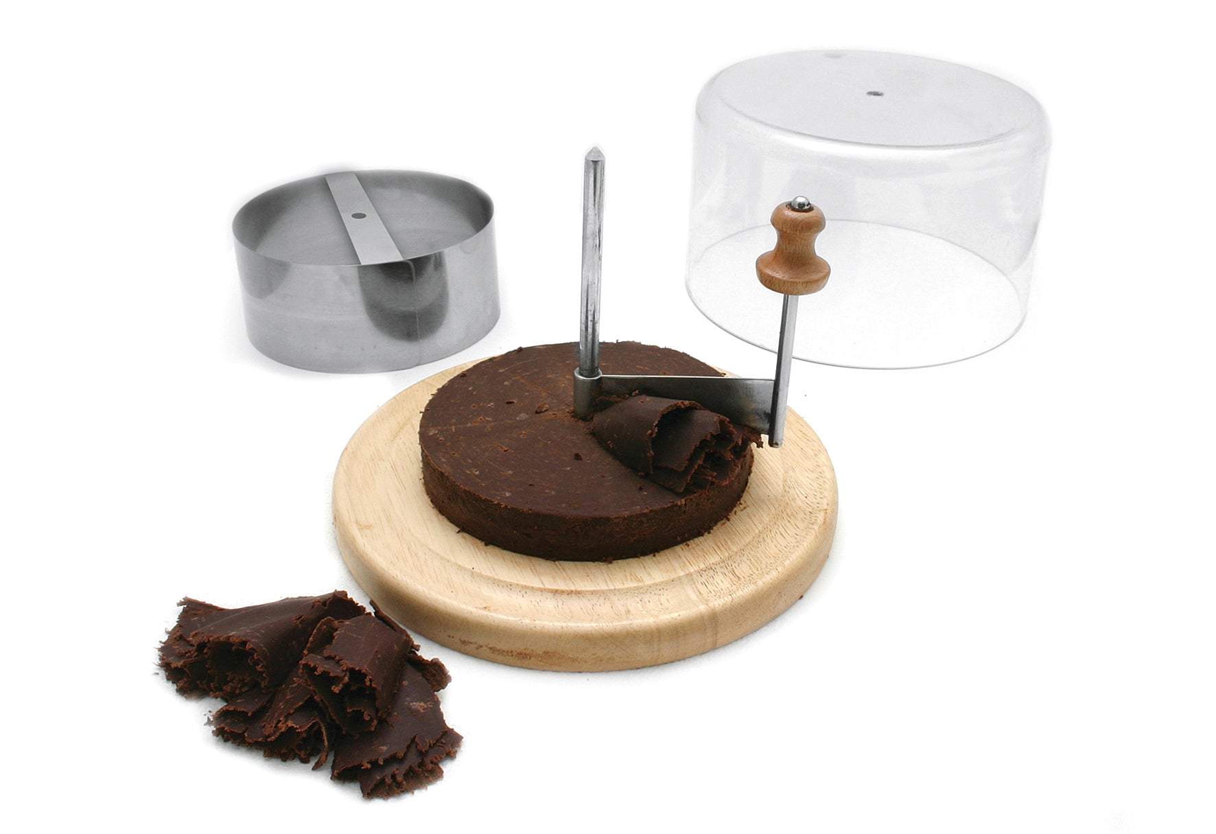 - Edelstahl, Inhalt: 1 Edelstahlklinge mit Holzsockel, 1 Edelstahlform, 1 Frischhaltehaube, zum Herstellen von feinen Käse oder Schokoblättchen, die scharfe Klinge am schwenkbaren Griff raspelt Käse und Schokolade in dünne Blättchen, die Edelstahlform vereinfacht das Formen geschmolzener Schokolade