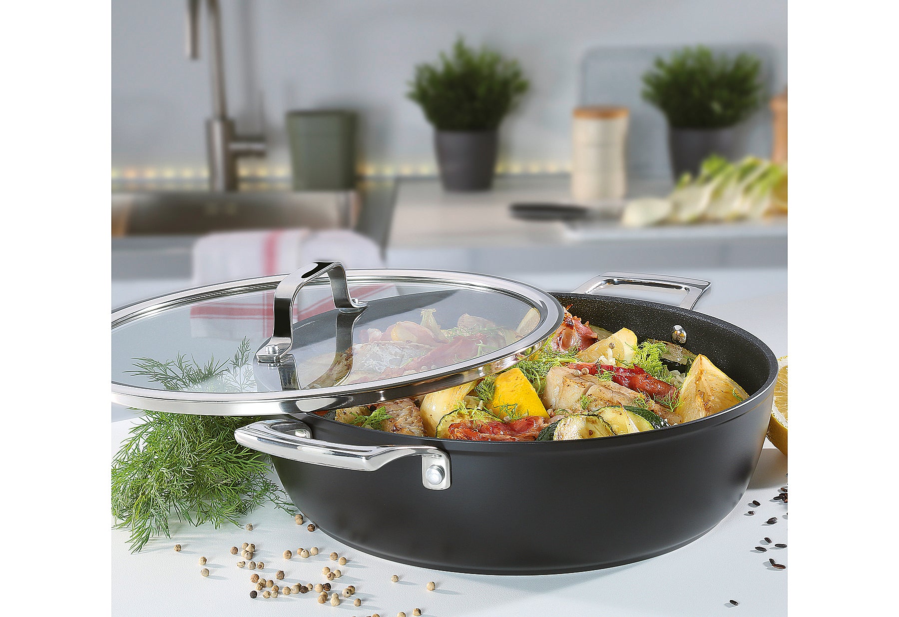 100% recyceltes Aluminium, hervorragende Wärmeverteilung, 3-fach Antihaftversiegelung, inklusive Glasdeckel, backofenfest, spülmaschinengeeignet, für alle Herdarten geeignet, inkl. Induktion 4 l, H 7,5 cm, Ø 28 cm