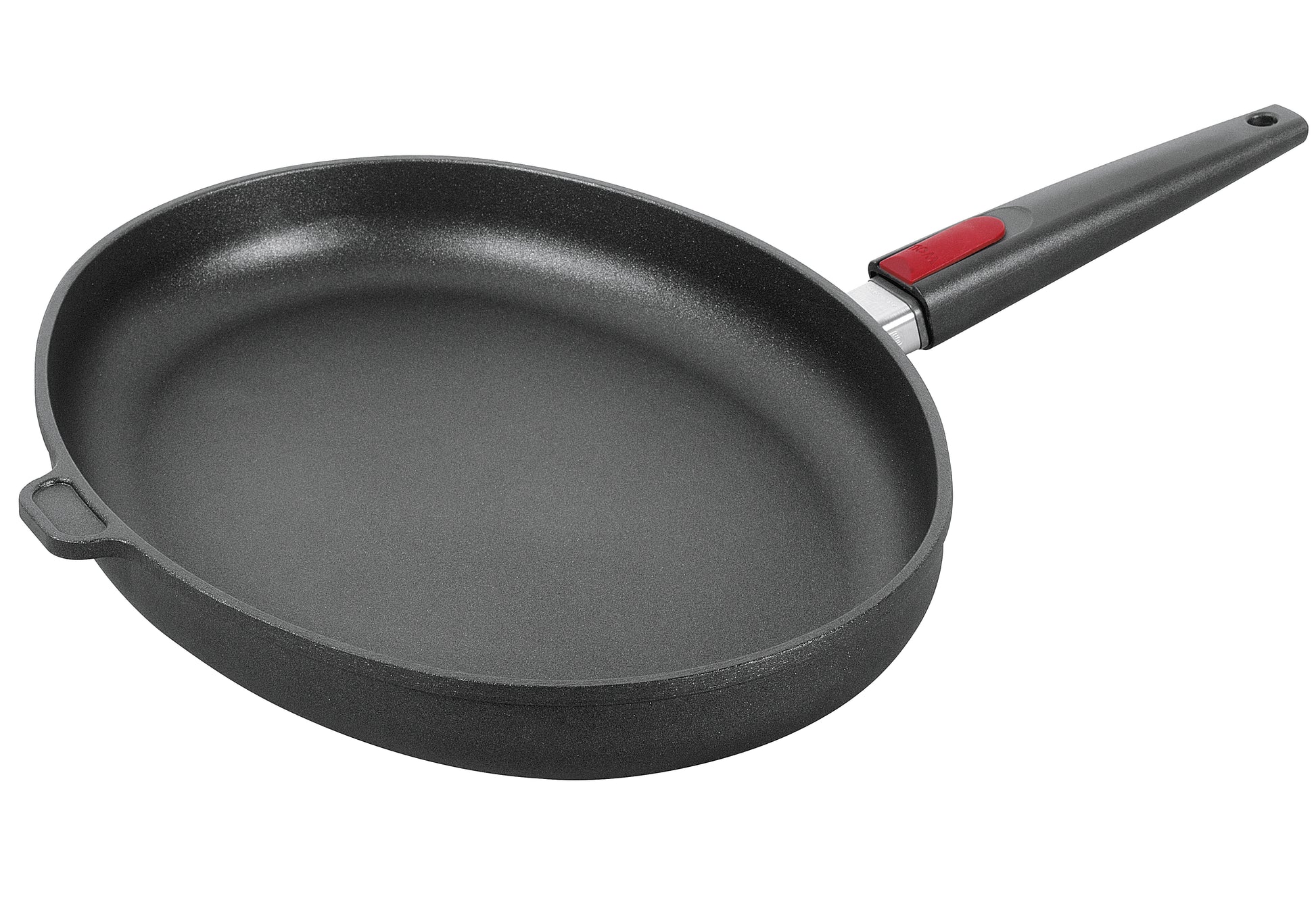 - Aluguss, schnitt- und abriebfeste Titanium-Hartgrundversiegelung, ca. 8 mm gegossener Thermoboden für optimale Wärmespeicherung, bis 250°C backofenfest, mit abnehmbarem Stiel,nicht induktionsgeeignet