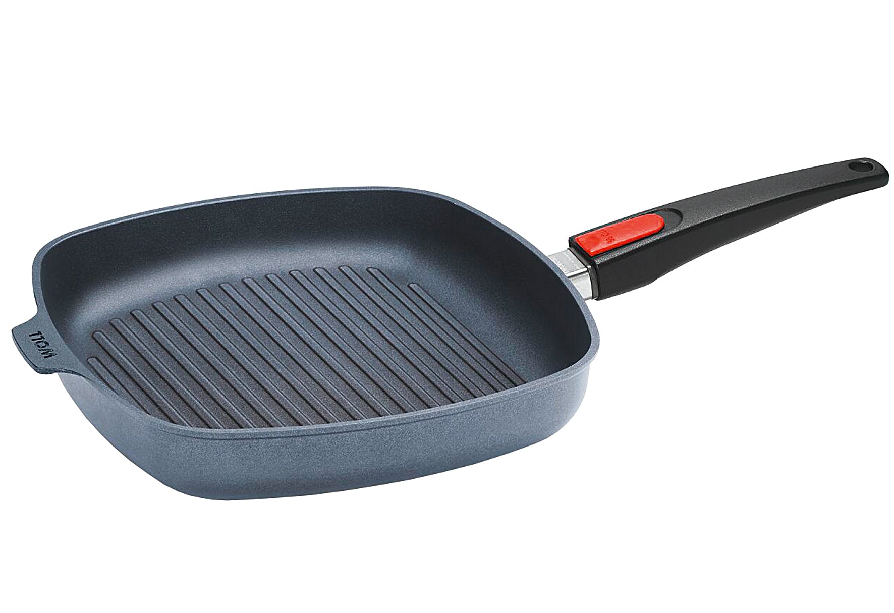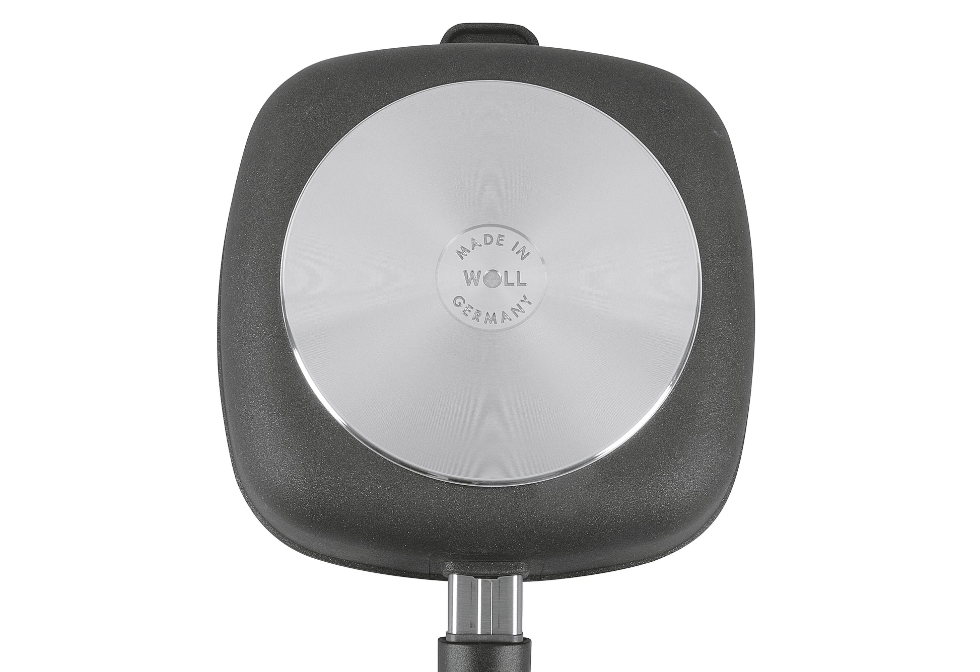 - Aluguss, schnitt- und abriebfeste Titanium-Hartgrundversiegelung, ca. 8 mm gegossener Thermoboden für optimale Wärmespeicherung, bis 250°C backofenfest, mit abnehmbarem Stiel, nicht induktionsgeeignet
