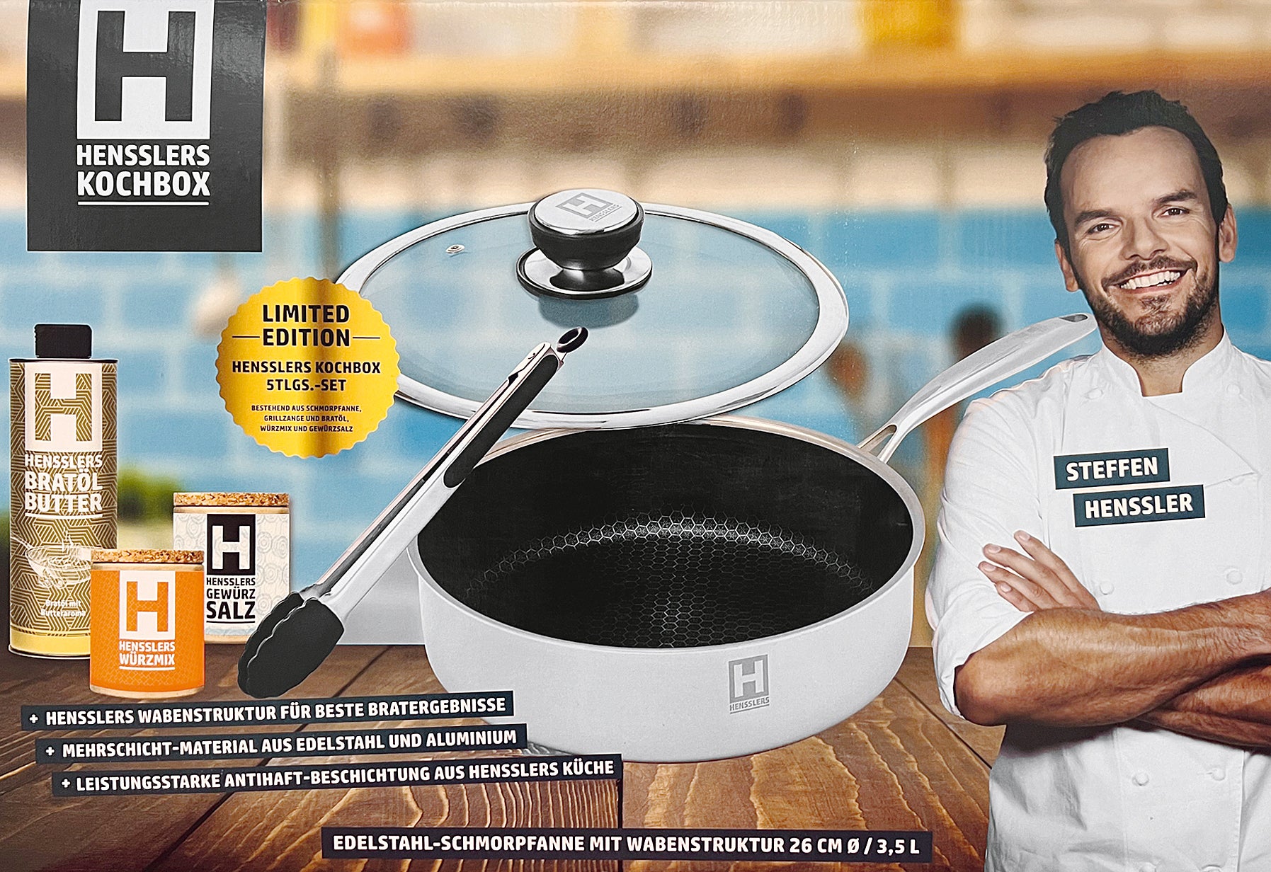 Inhalt: Schmorpfanne Ø 26 cm, Höhe 7,8 cm (mit Deckel 14 cm), Mehrschichtmaterial für hohe Beständigkeit und Kratzfestigkeit, Wabenstruktur mit Antihaftbeschichtung, für alle Herdarten inkl. Induktion geeignet, inklusive Glasdeckel, Grillzange, Bratöl, 2x Gewürze und original Henssler-Rezept