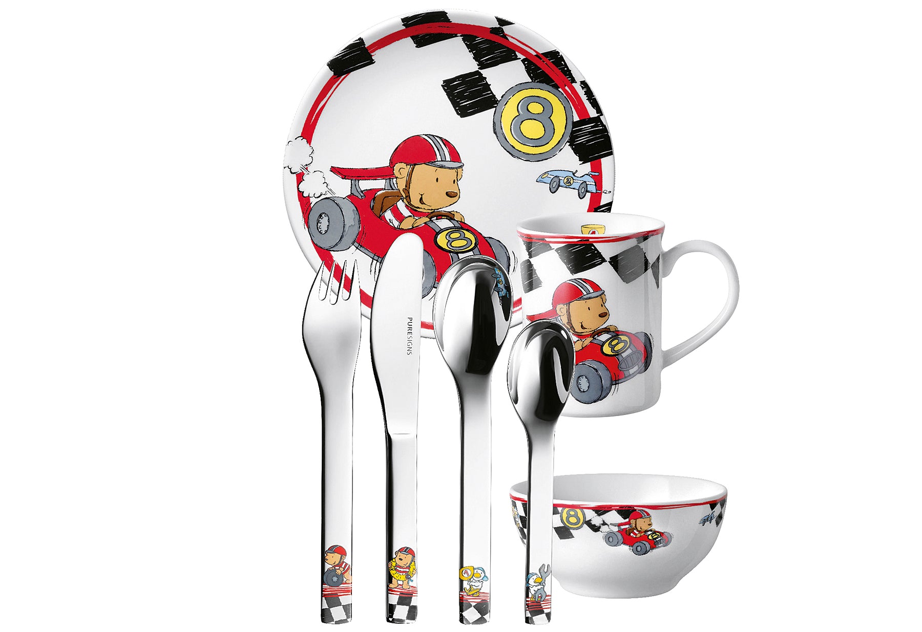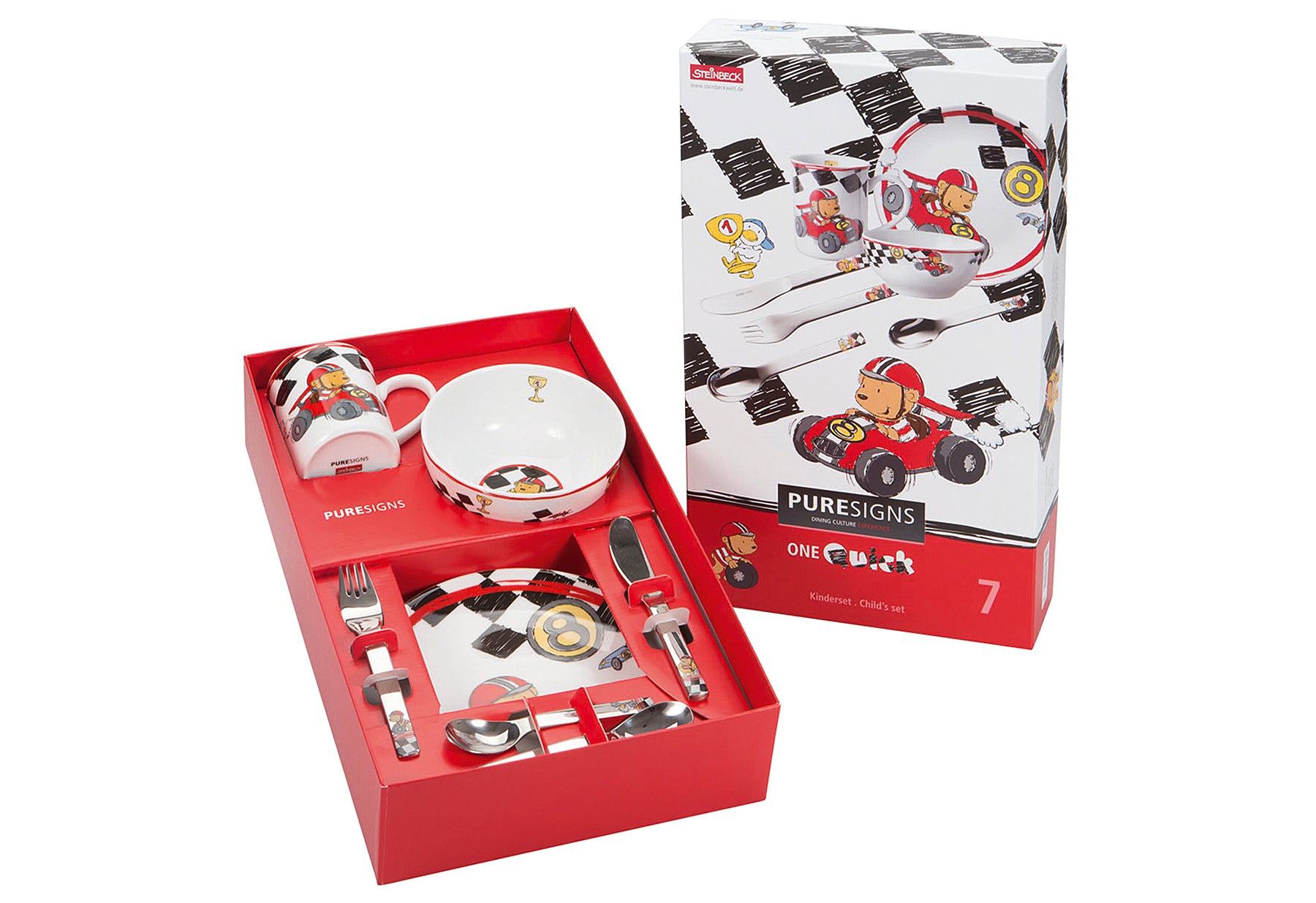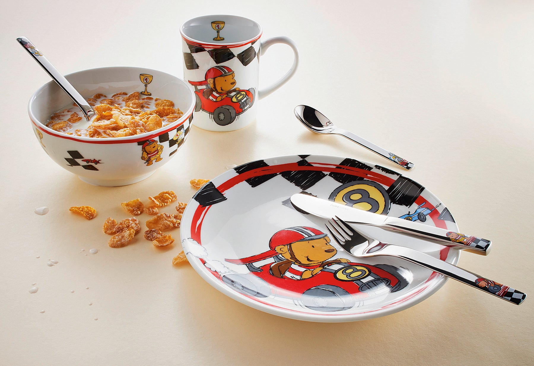 Edelstahl 18/10 / Porzellan, Motiv: Steinbeck, Inhalt: 1 Becher Ø 6,2 cm/ H 9 cm, 1 Müslischale Ø 14 cm, 1 Teller Ø 20,5 cm, Besteck-Set 4-teilig, spülmaschinengeeignet