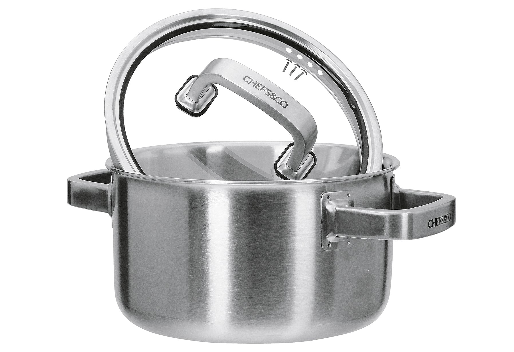 Edelstahl 18/10, dreilagiger Materialaufbau (3-ply), optimale Wärmespeicherung und -verteilung, ergonomische Kaltgriffe, ausgeprägter Schüttrand, Mess-Skala, optimal für Kochfelder mit Muldenlüfter geeignet, für alle Herdarten inkl. Induktion geeignet, spülmaschinenfest, mit Glasdeckel 3,4 l, Ø 20 cm