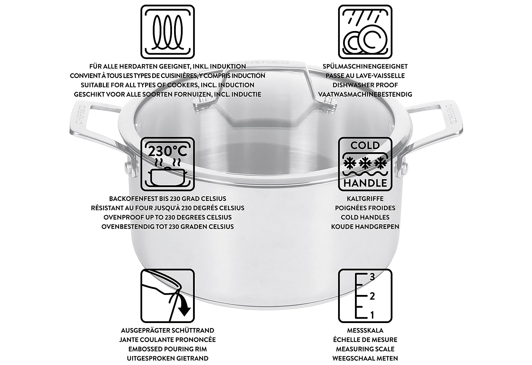 - Edelstahl, optimale Wärmespeicherung und -verteilung, ergonomische Kaltgriffe, Sichtkochen dank Dampföffnung im Glasdeckel, für alle Herdarten geeignet 5,4 l, Ø 24 cm