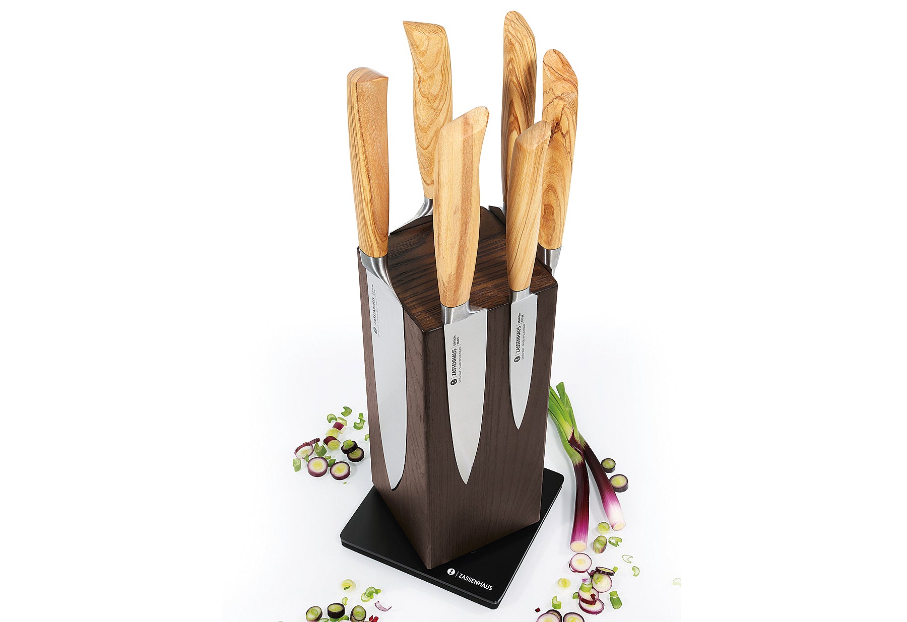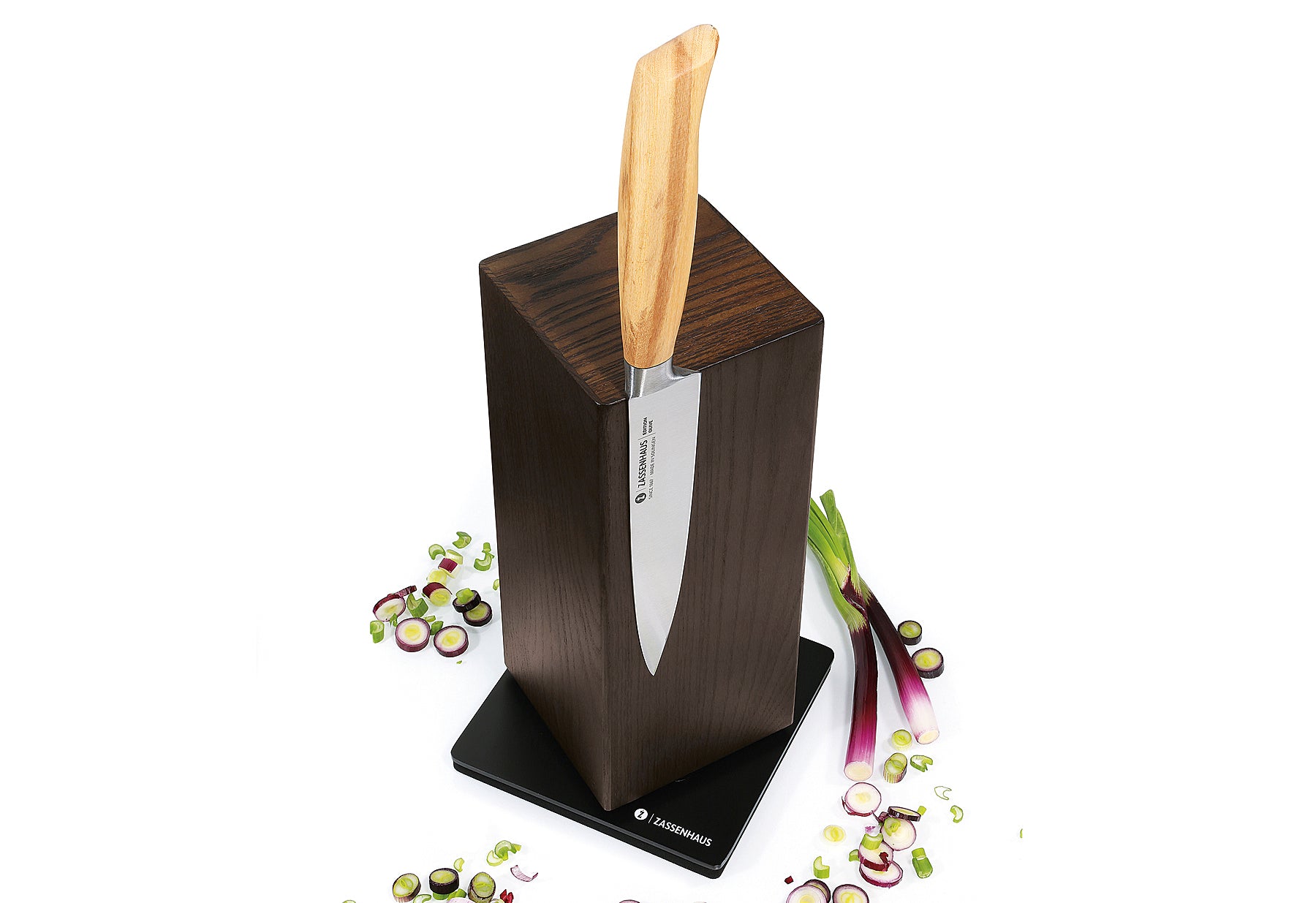 - für bis zu 8 Messer mit einer Klingenlänge bis 23, cm, drehbar - kugelgelagert, standsichere, oberflächenschonende Basisplatte, elegantes und zeitloses Design, Eschenholz , Edelstahl, schwarz beschichtet