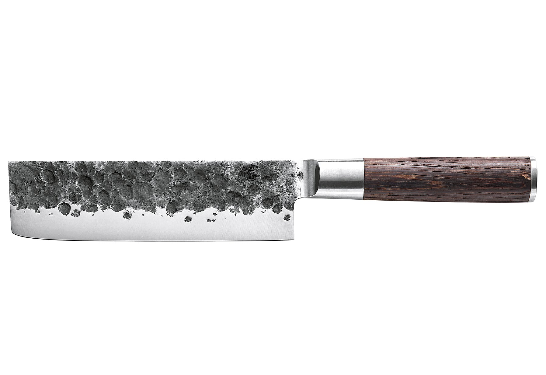 - Wengeholz / Klingenstahl (440C), von Hand geschmiedet, gehärtet, geschliffen und poliert, Härtegrad 60 HRC, Schleifwinkel 15°