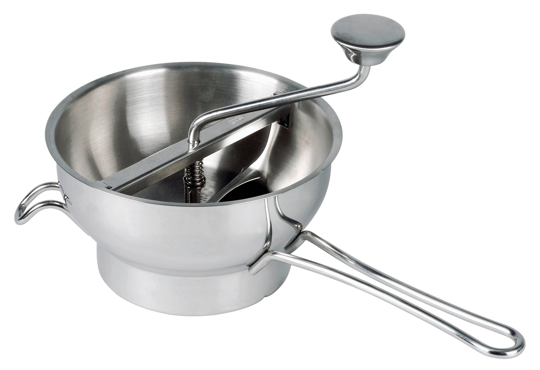 - Edelstahl rostfrei, mit 2 Lochscheiben (2,0 und 3,0 mm) und patentiertem Abstreifer, 2 l Volumen, spülmaschinengeeignet