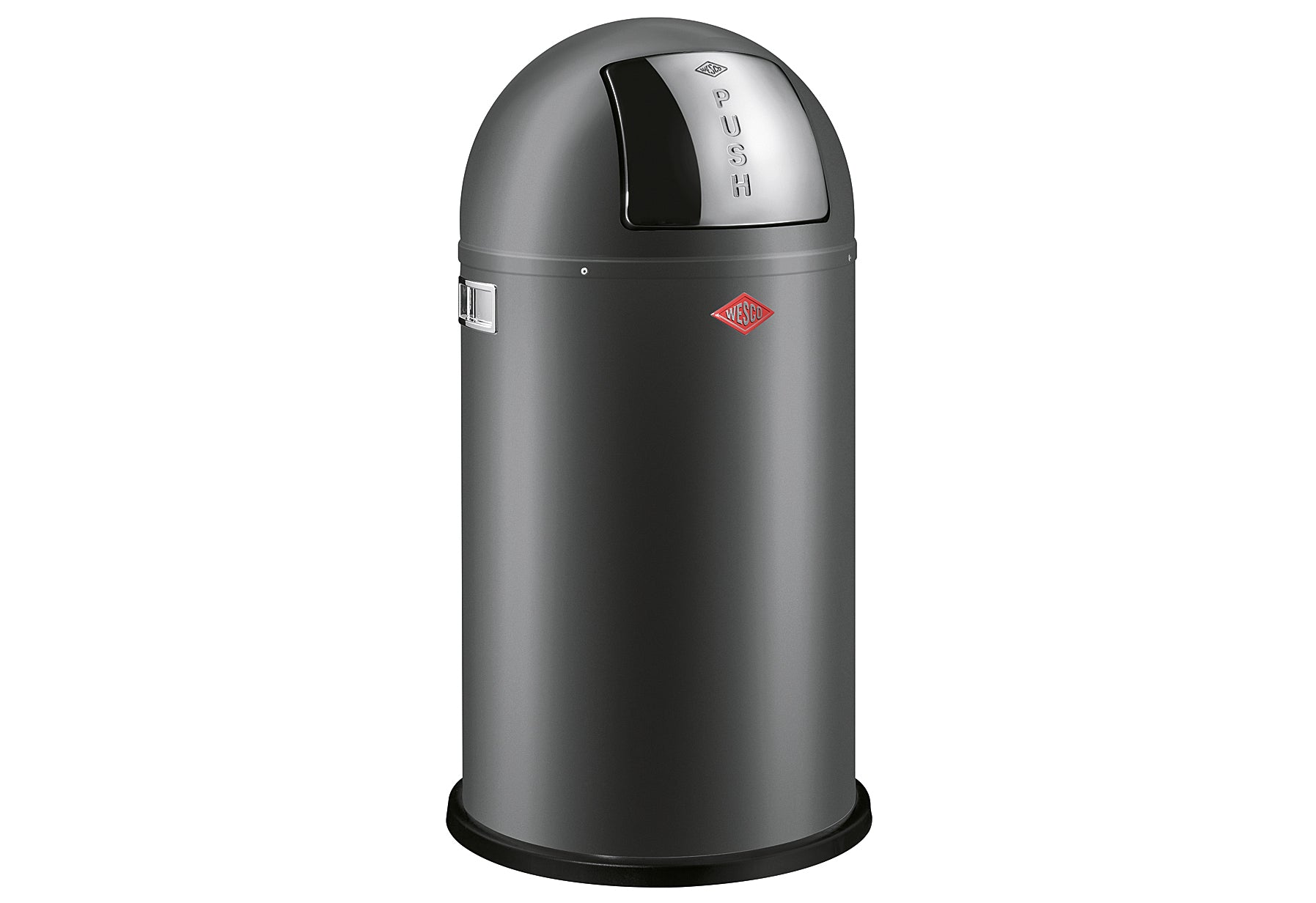- Stahlblech, pulverbeschichtet / Kunststoff, mit Edelstahlklappe, Einsatz aus Metall, ein Kunststoffrand am Korpus schont den Fußboden, der Leitring im Innern verhindert, dass Müll zwischen Korpus und Einsatz rutscht