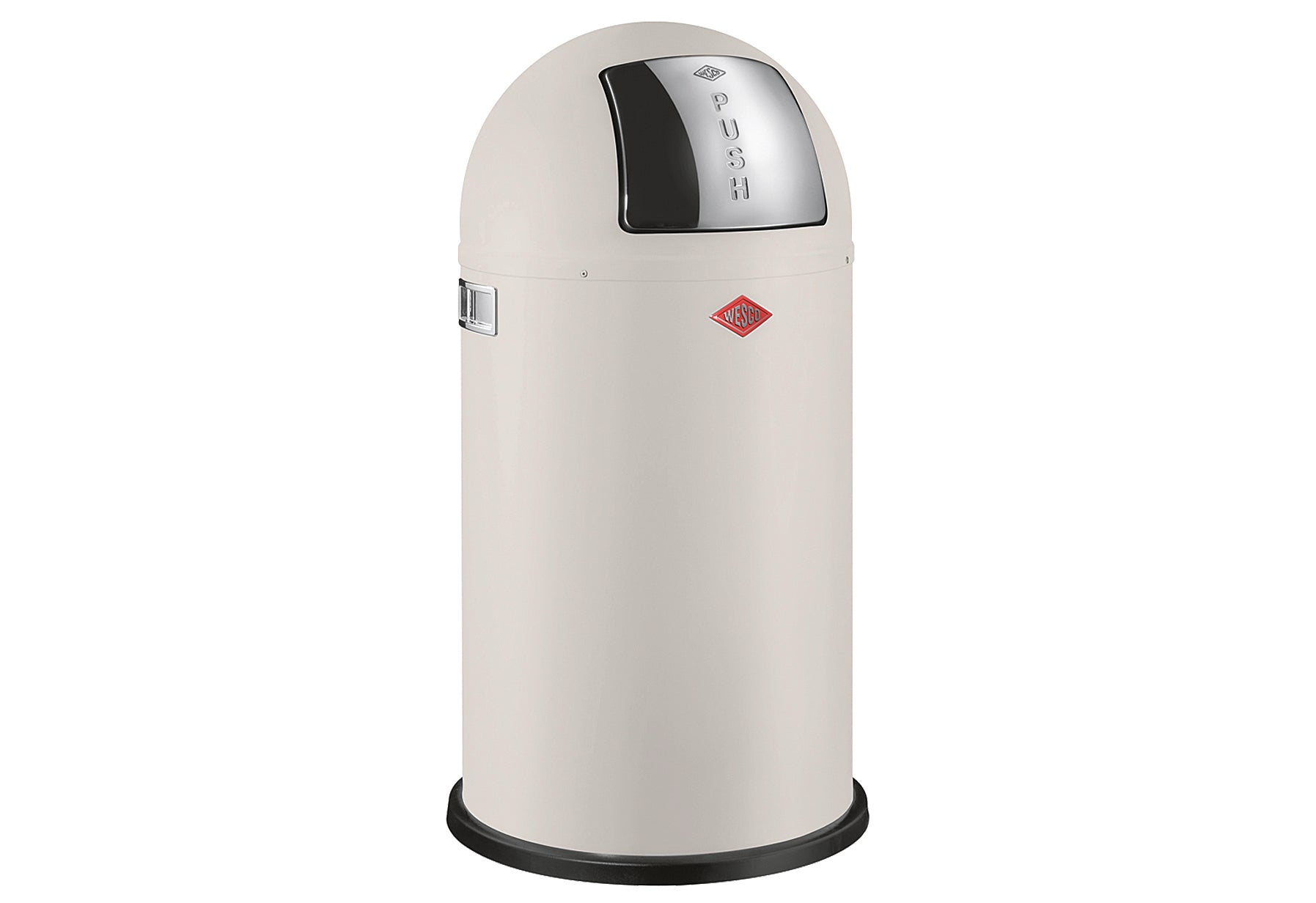 - Stahlblech, pulverbeschichtet / Kunststoff, mit Edelstahlklappe, Einsatz aus Metall, ein Kunststoffrand am Korpus schont den Fußboden, der Leitring im Innern verhindert, dass Müll zwischen Korpus und Einsatz rutscht