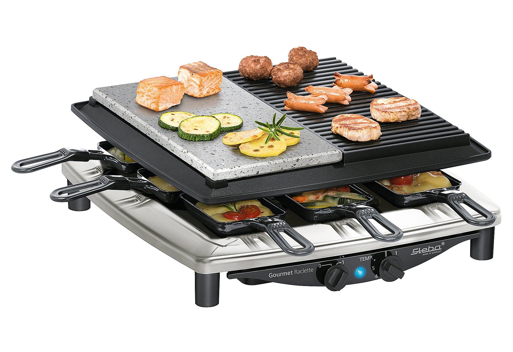 Edelstahlgehäuse, Antihaft-Druckguss-Grillplatte (29 x 14,5cm), Natursteingrillplatte, schneid- und kratzfest (29 x 14,5cm), Inkl. wendbarer Guss-Pfanne mit glatter Fläche, 8 emaillierte Pfännchen - Spülmaschinengeeignet - Schneid- und kratzfest, Grillfläche insgesamt 29 x 29 cm, Fettauffang für Bratenflüssigkeit, Stufenloser Temperaturregler, Ein-/Aus- Schalter, Leichte Reinigung, Betriebskontrollleuchte,1,7 m Anschlusskabel, Kabelaufwicklung,Leistung: 1450 W, Schukostecker CEE 7/7