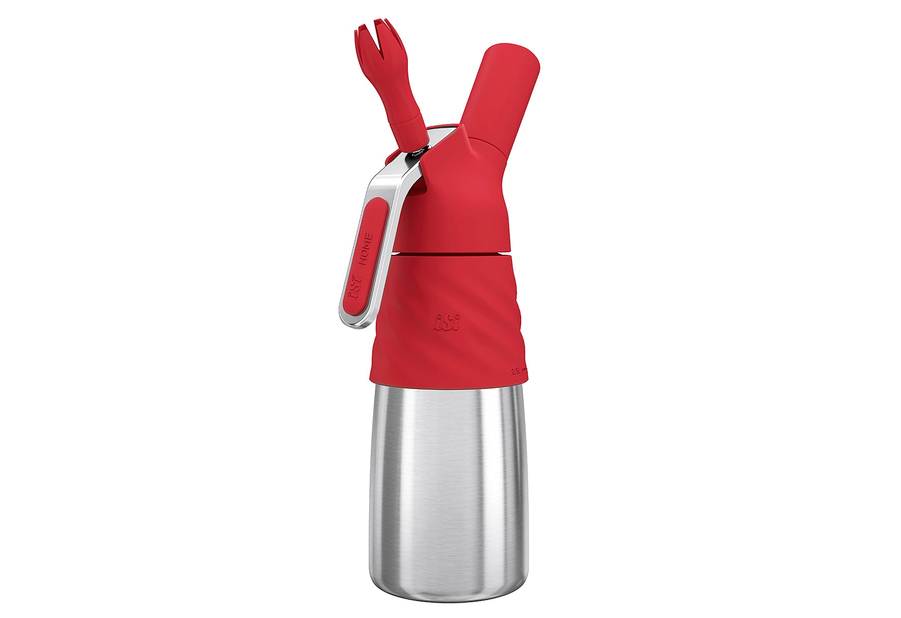 - Edelstahl / Silikon, spülmaschinenfest (ausgenommen Kunststofftüllen), Flaschenkörper aus europäischem Edelstahl, Gerätekopf und Kapselhalter aus Premium Edelstahl, Flasche und -Kopf z.T. silikonummantelt, Flaschencover mit trendigem Wave-Design und Kapselhalter aus Silikon, nur für kalte Anwendungen geeignet, das geschlossene System erlaubt, die kalten Zubereitungen mehrere Tage bei gleichbleibender Qualität ohne Zusatz von Konservierungsstoffen im Kühlschrank zu lagern, inklusive 2 iSi Professional Chargers, 2 Garniertüllen (Stern, Tulpe) aus hochwertigem Kunststoff, 1 Rezeptheft, 1 Kapselhalter und 1 Reinigungsbürste, nicht für den professionellen Einsatz in der Gastronomie geeignet