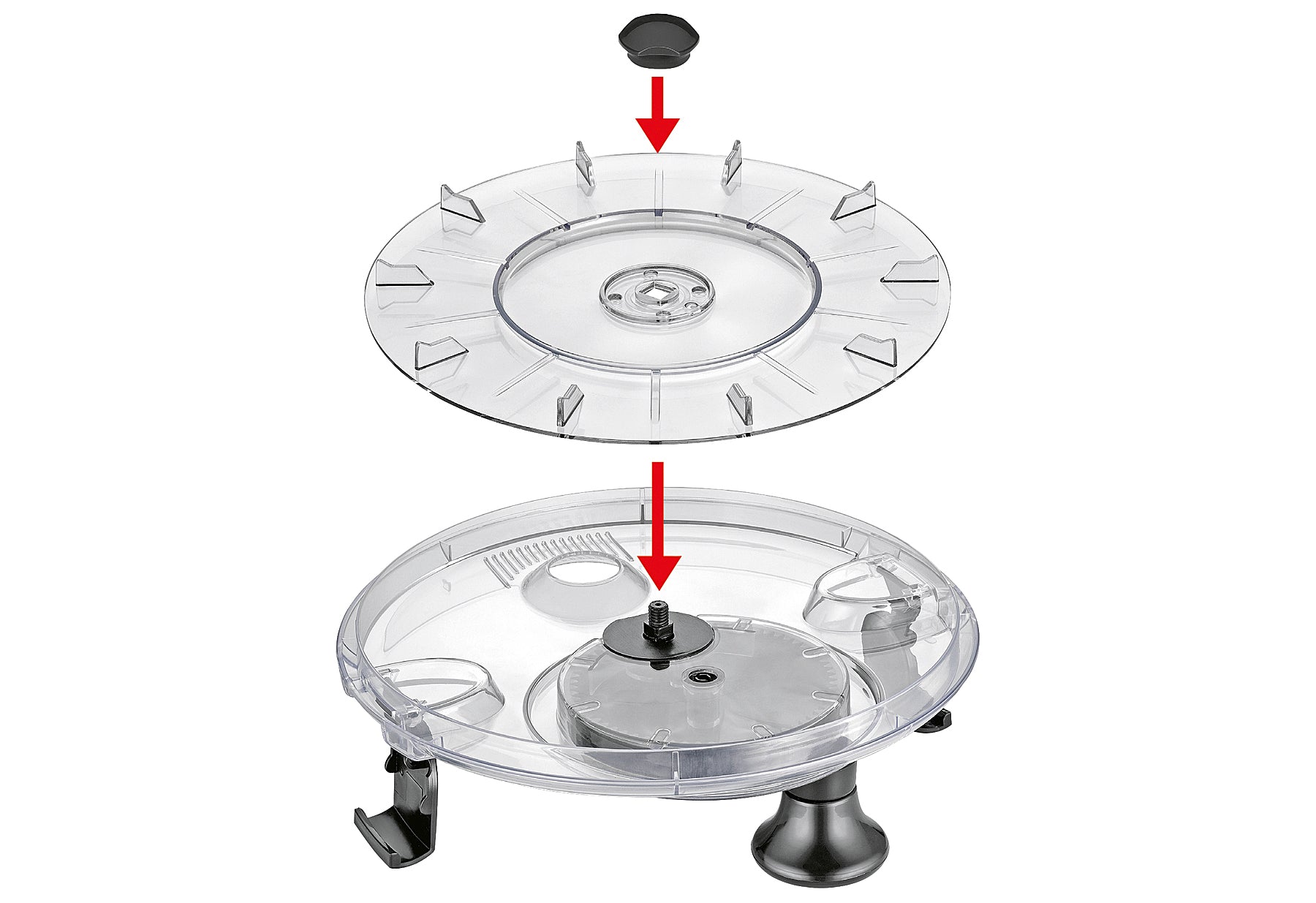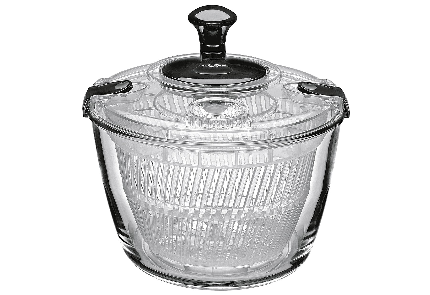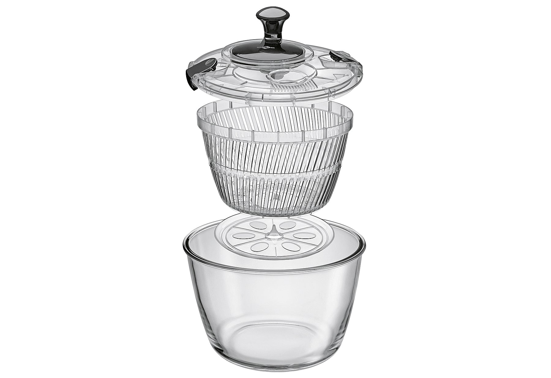 Borosilikatglas / hochwertiger Kunststoff, Inhalt: Glasschüssel, Korb, Basisplatte und Deckel mit Kurbel, mit praktischer Öffnung zum Einfüllen und Abgießen 4,0 l, Ø 24,5 cm, H 22 cm