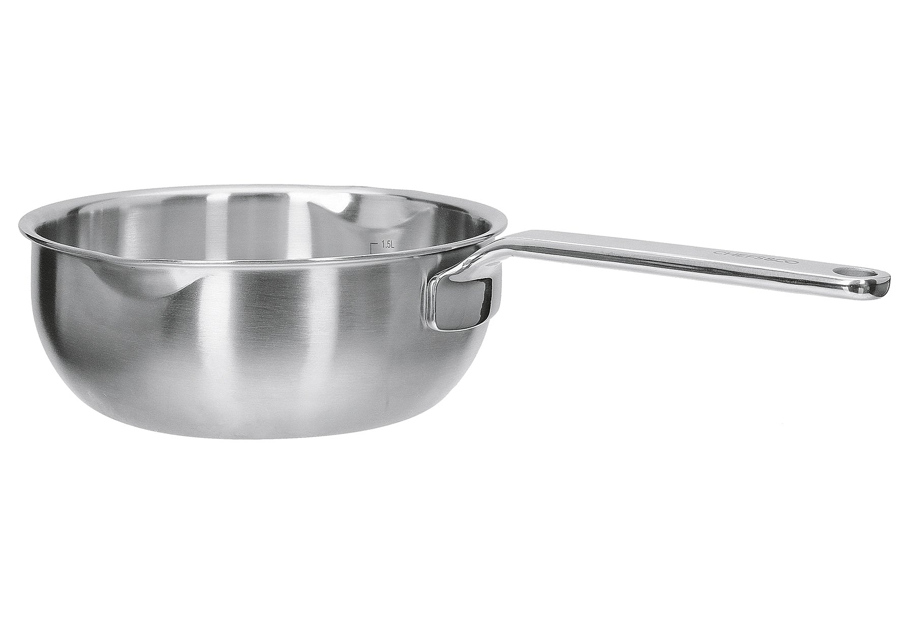 Edelstahl 18/10, dreilagiger Materialaufbau (3-ply), optimale Wärmespeicherung und -verteilung, ergonomische Kaltgriffe, ausgeprägter Schüttrand, Mess-Skala, optimal für Kochfelder mit Muldenlüfter geeignet, für alle Herdarten inkl. Induktion geeignet, spülmaschinenfest 2,2 l, Ø 20 cm
