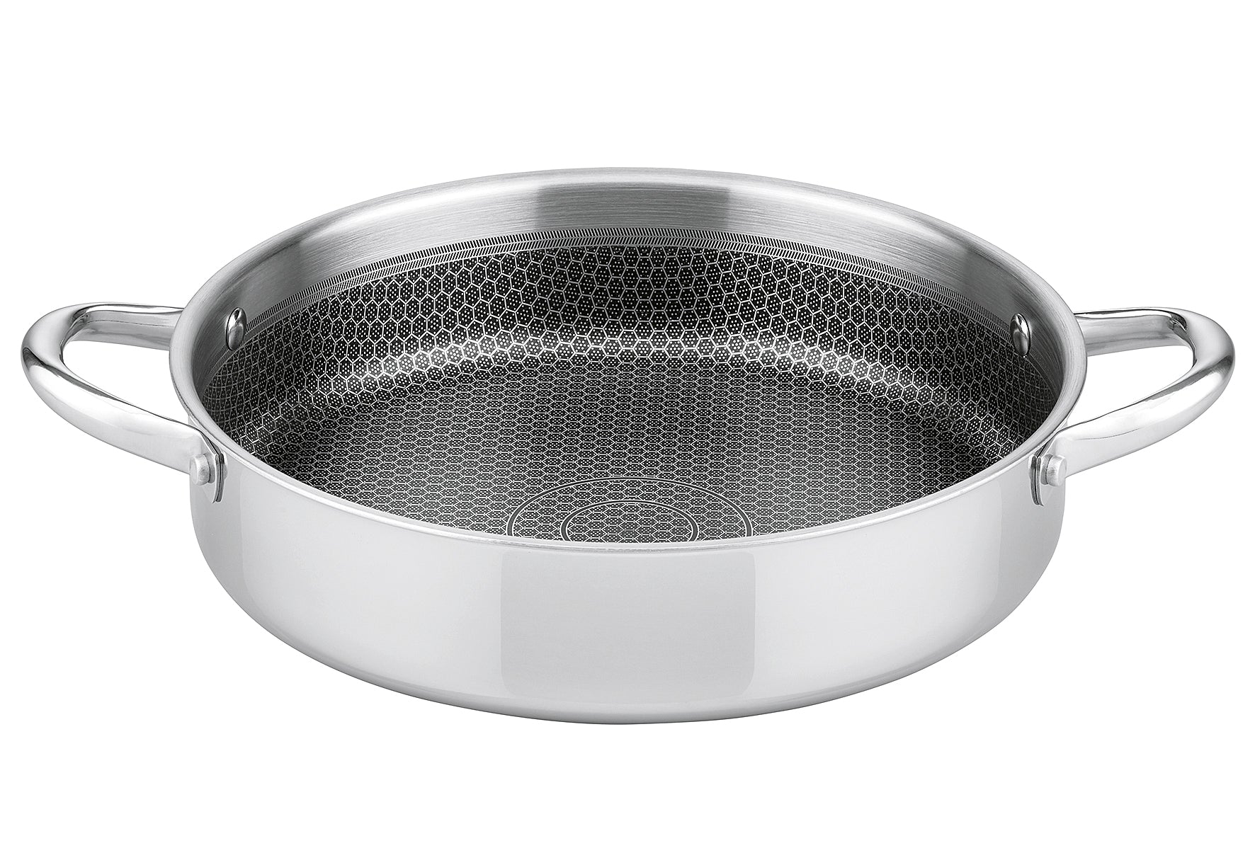 Edelstahl / Aluminium, Gesamtmaterialstärke ca. 2,5 mm, mit Wabenboden ELODUR® Professional, die erhabene Edelstahlstruktur schützt die Antihaftversiegelung perfekt und ist kratzfest, ohne PFAS, für alle Herdarten geeignet, mit Öl-Dosiersystem, gleichmäßige Wärmeverteilung vom Boden bis zum Rand, backofenfest bis 240 °C (mit Glasdeckel 180 °C) 3,6 l, Ø 28 cm, H 6,9 cm