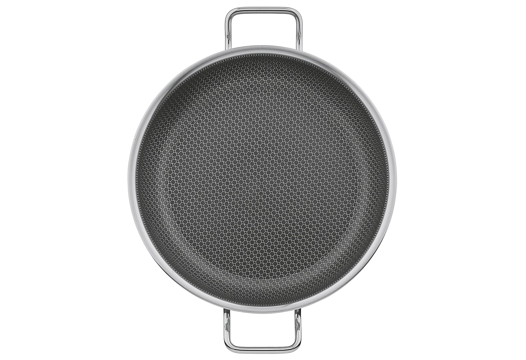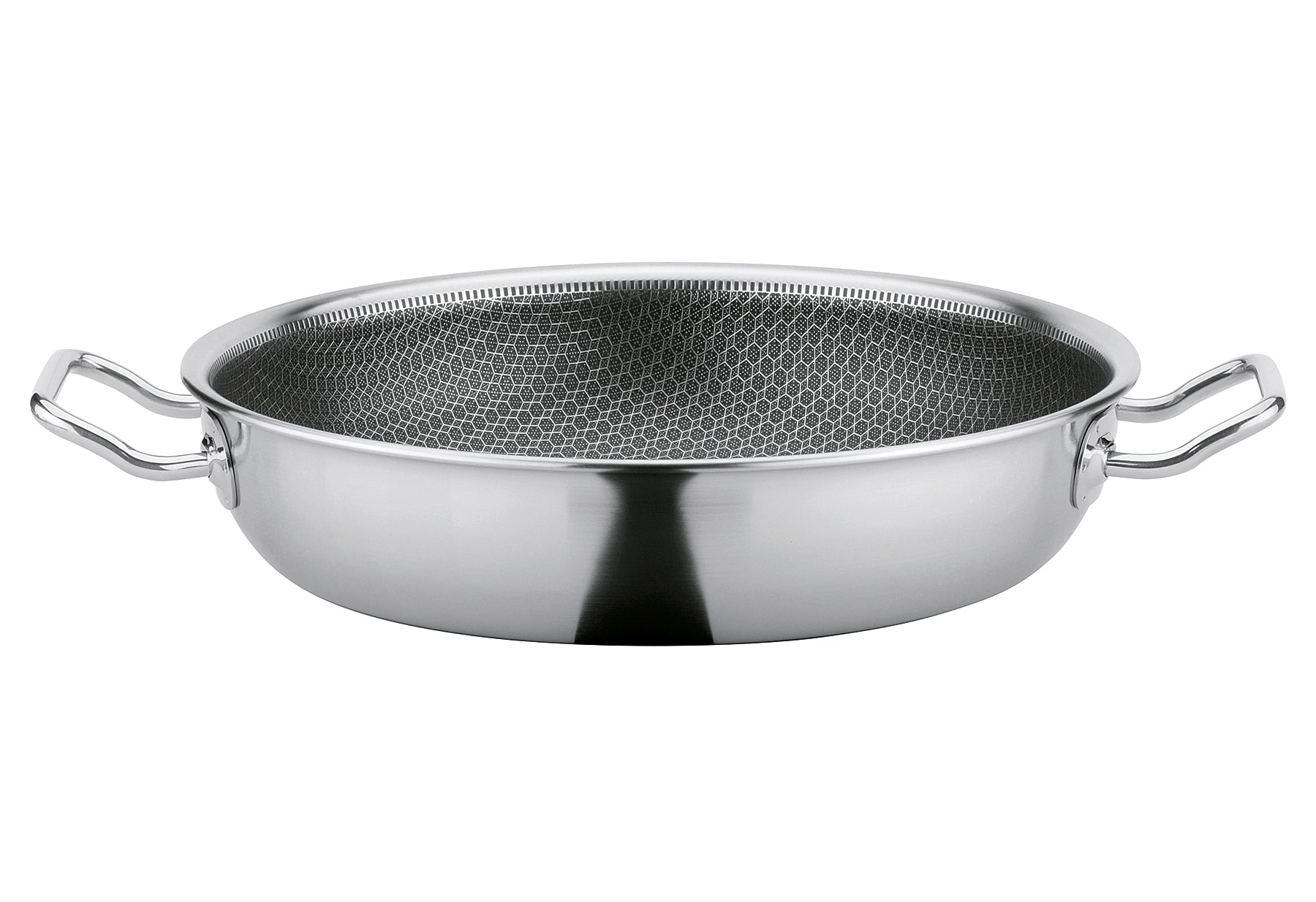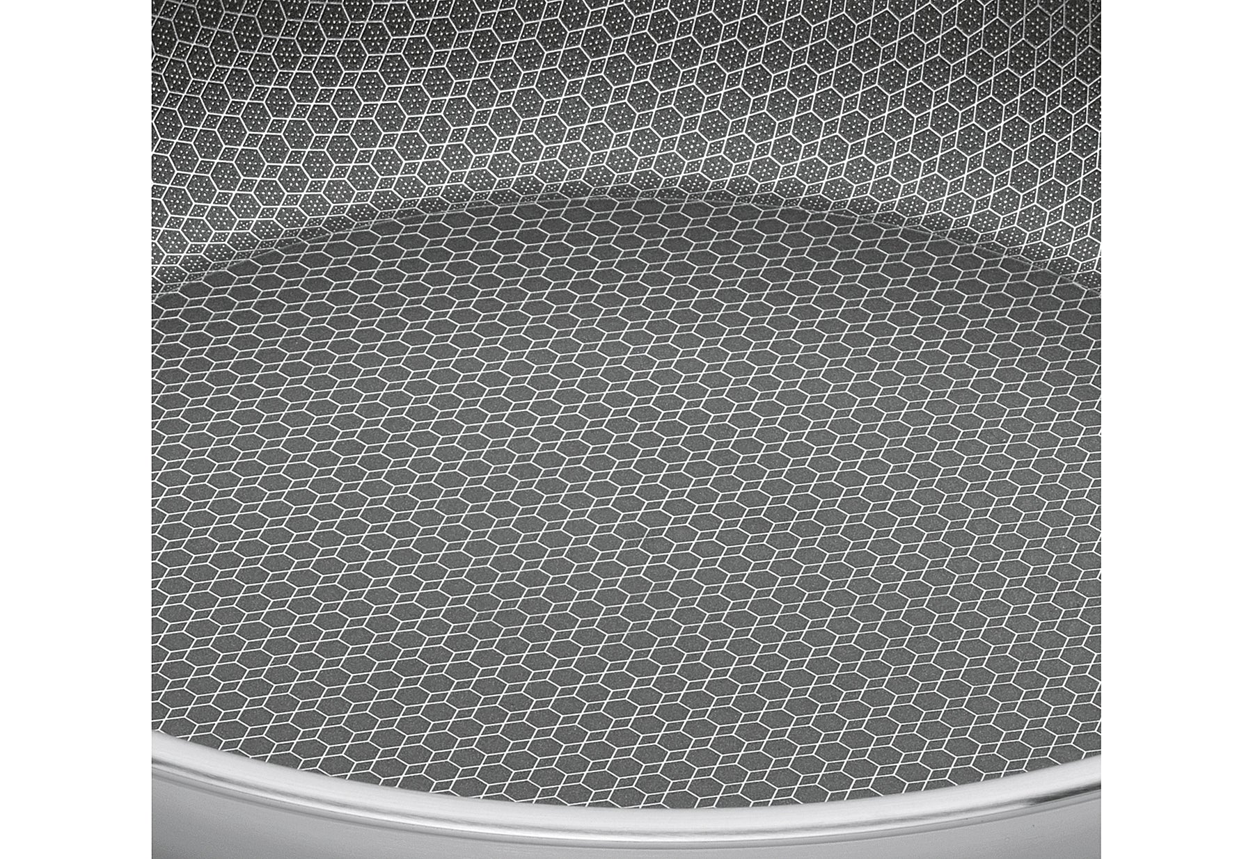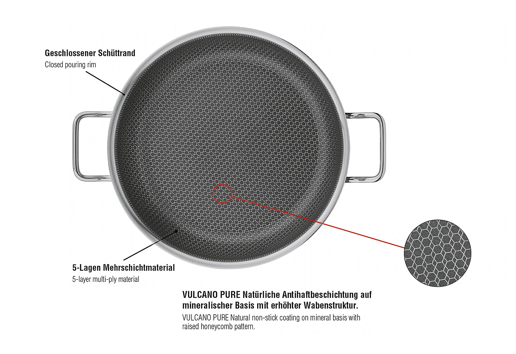 5-Lagen Mehrschichtmaterial Außenschicht aus, induktionstauglichem Edelstahl 18/0, innen, Edelstahlschicht 18/10 und dreifachem, Aluminiumkern. 2-fach Antihaftbeschichtung auf, mineralischer Basis für höchste Abriebfestigkeit, und optimierten Antihafteffekt für lange, Lebensdauer. PFAS-frei., Erhabene Wabenstruktur aus Edelstahl. Geeignet, für Pfannenwender aus Metall., Optimale Wärmeverteilung., Geeignet für sämtliche Herdarten inklusive, Induktion. Backofenfest., Geschlossener Topf- und Schüttrand., Ø 28 cm / Höhe: 6,1 cm H 6,1 cm, Ø 28 cm
