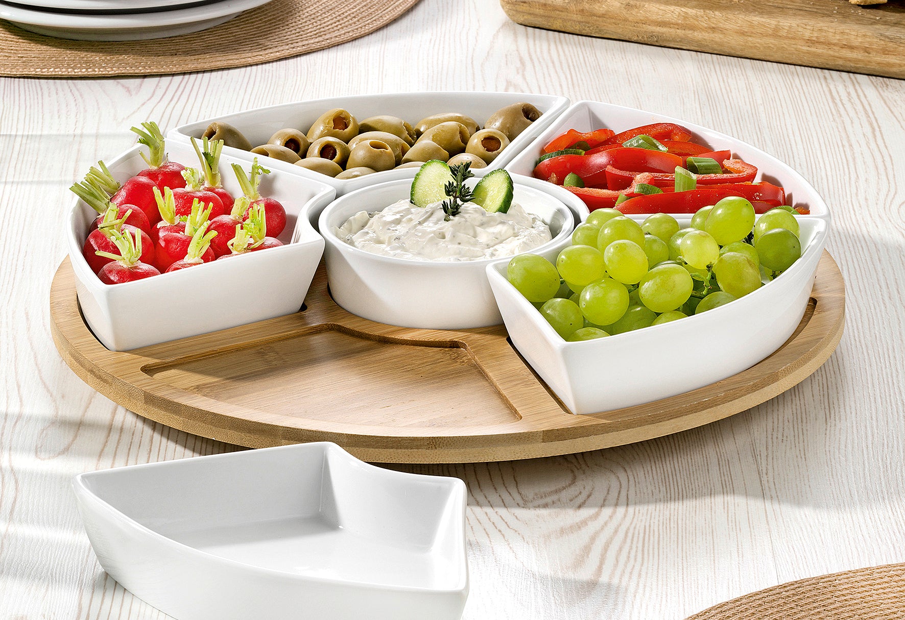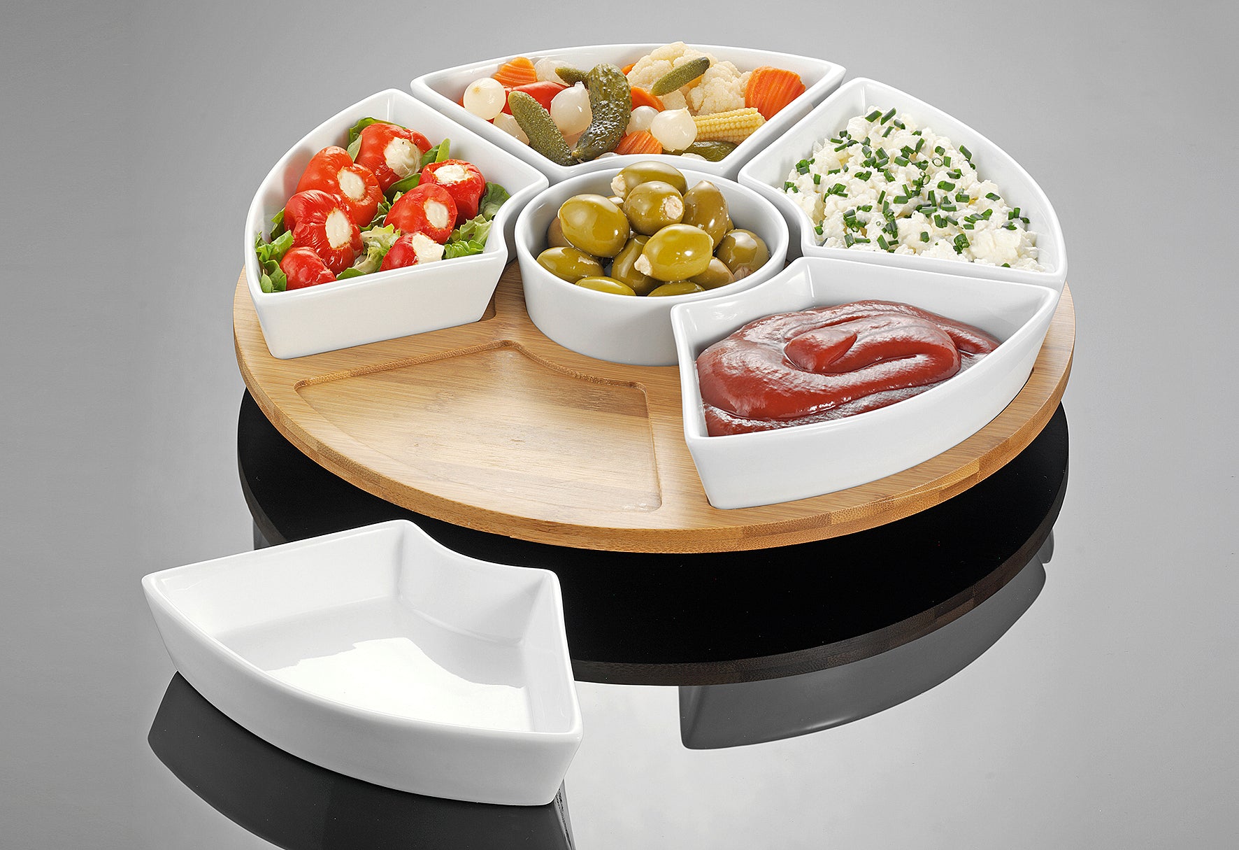 - Bambus / Porzellan, drehbar, Vertiefungen in der Bambusplatte verhindern ein Verrutschen der Porzellanschälchen