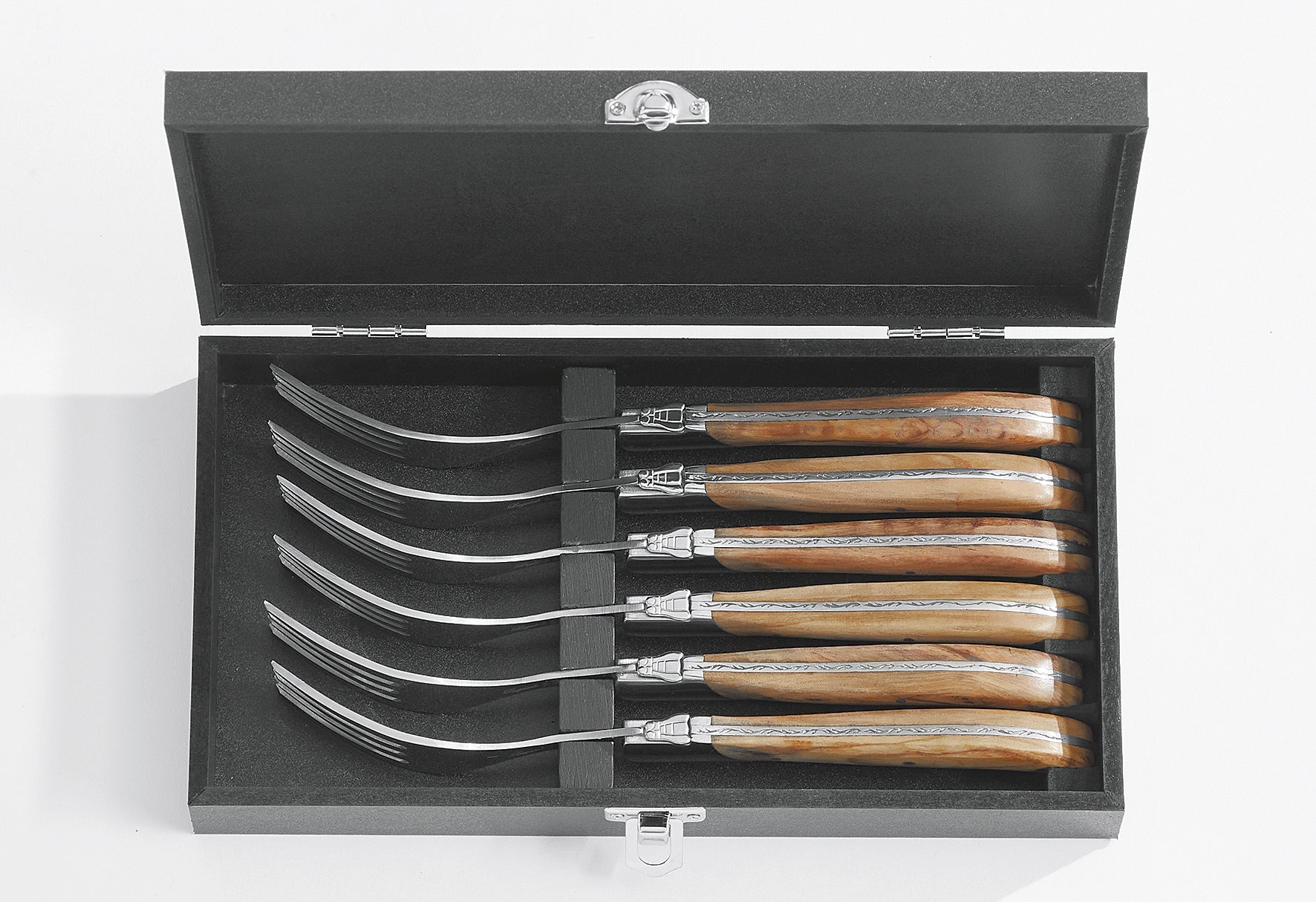 Griffe: Olivenholz / Zinken: Edelstahl / Box: Holz, nicht spülmaschinenfest, Maße der Box: (LxBxH): 24,6x13x4,7 cm