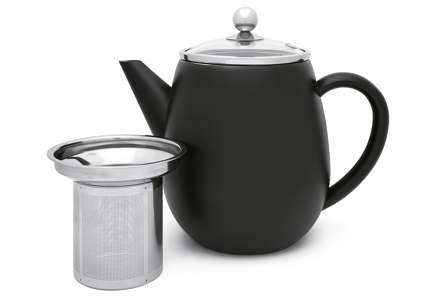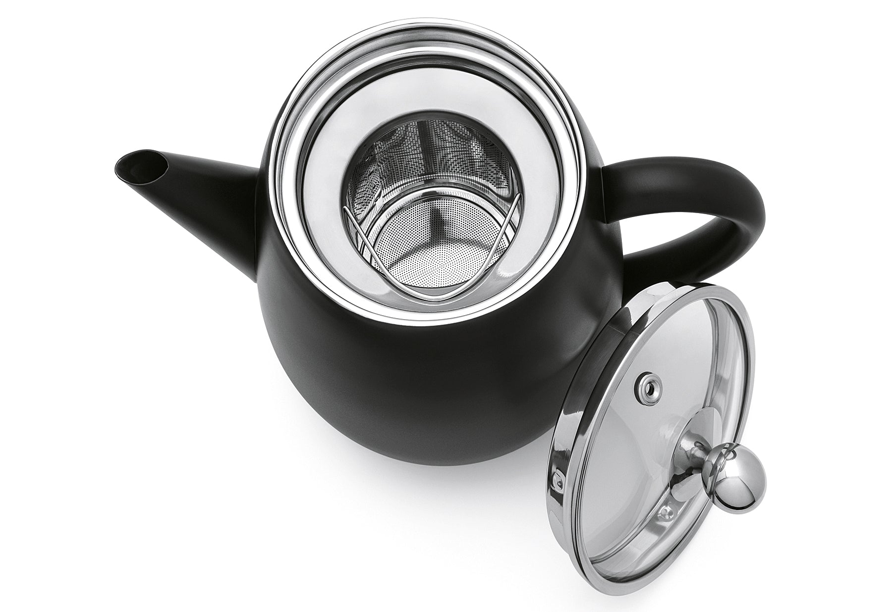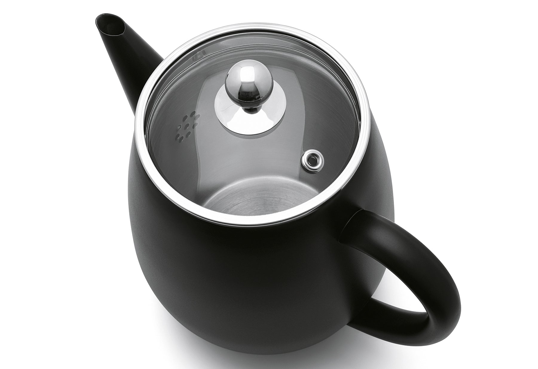 - Edelstahl, Deckel aus Glas, doppelte Isolierwand, Tee bleibt hierdurch eine Dreiviertelstunde bis zu einer Stunde lang heiß und geschmackvoll (wenn die Teekanne mindestens bis zu 90 % gefüllt ist), Tülle hat ein besonderes Design und tropft beim Einschenken nicht, Griff und Deckelknopf werden allenfalls handwarm, spülmaschinengeeignet, nicht mikrowellengeeignet