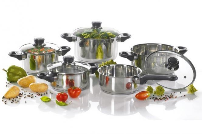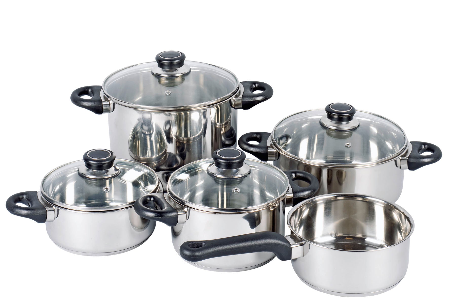 Edelstahl rostfrei, Inhalt: je 1 x Bratentopf Ø 16, 20 cm, je 1 x Fleischtopf Ø 16, 20 cm mit Glasdeckel, 1 x Stieltopf Ø 16 cm, Materialstärke 0,4 mm, 3 mm Kapselboden, schwarze Kunststoffgriffe, Glasdeckel mit Lüftungsloch und schwarze Kunststoffgriffe, hitzebeständig bis 160°C, für alle Herdarten inkl. Induktion geeignet, spülmaschinenbeständig