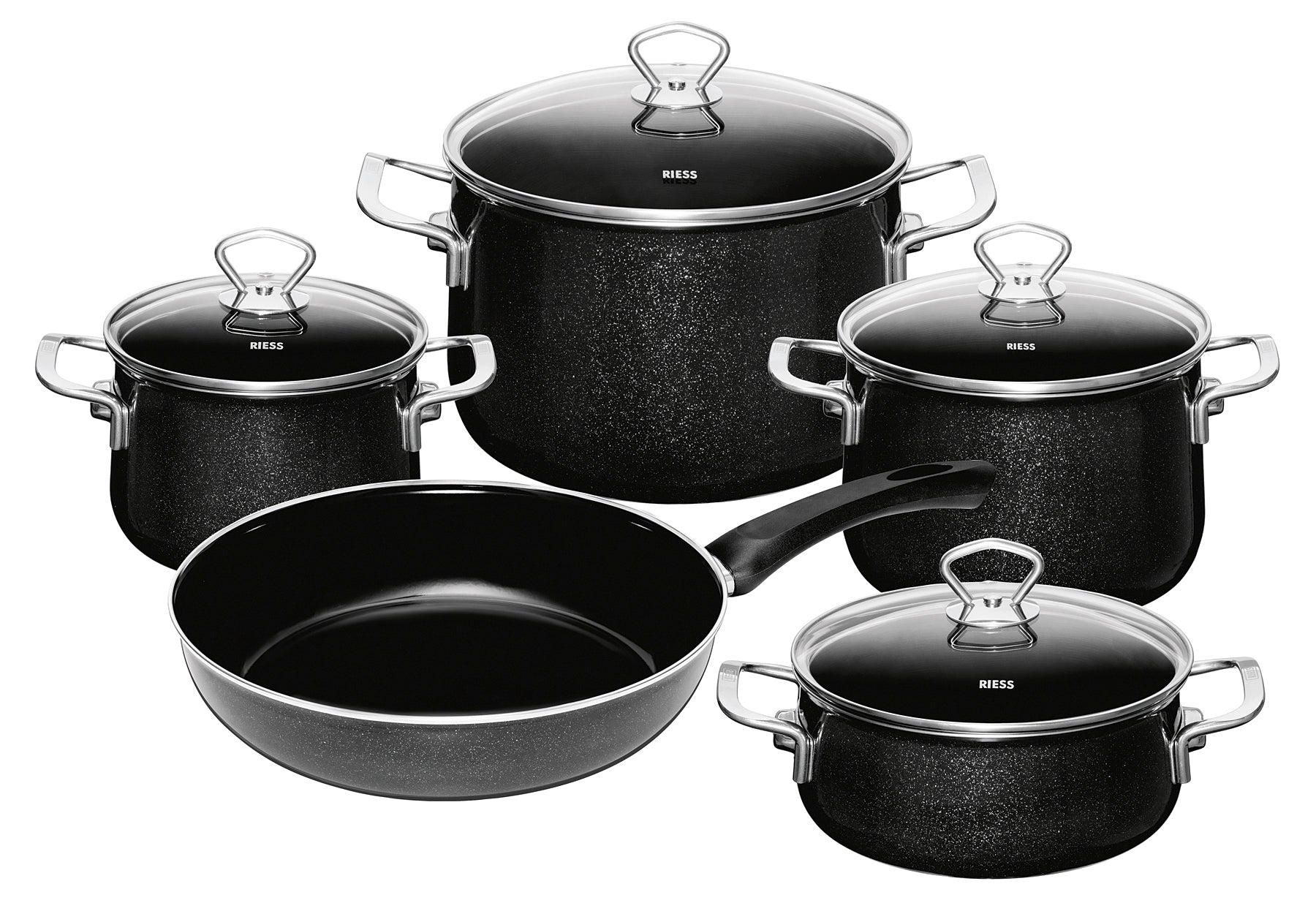 - emailliertes Stahlblech, Inhalt: je 1 x Fleischtopf Ø 16,20,24 cm, 1 x Kasserolle Ø 20 cm, mit Edelstahlgriffen und 1 x Bratpfanne mit Kunststoffgriff Ø 28 cm, gute Wärmeleitung, robuster Chromrand, für alle Herdarten geeignet