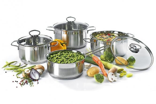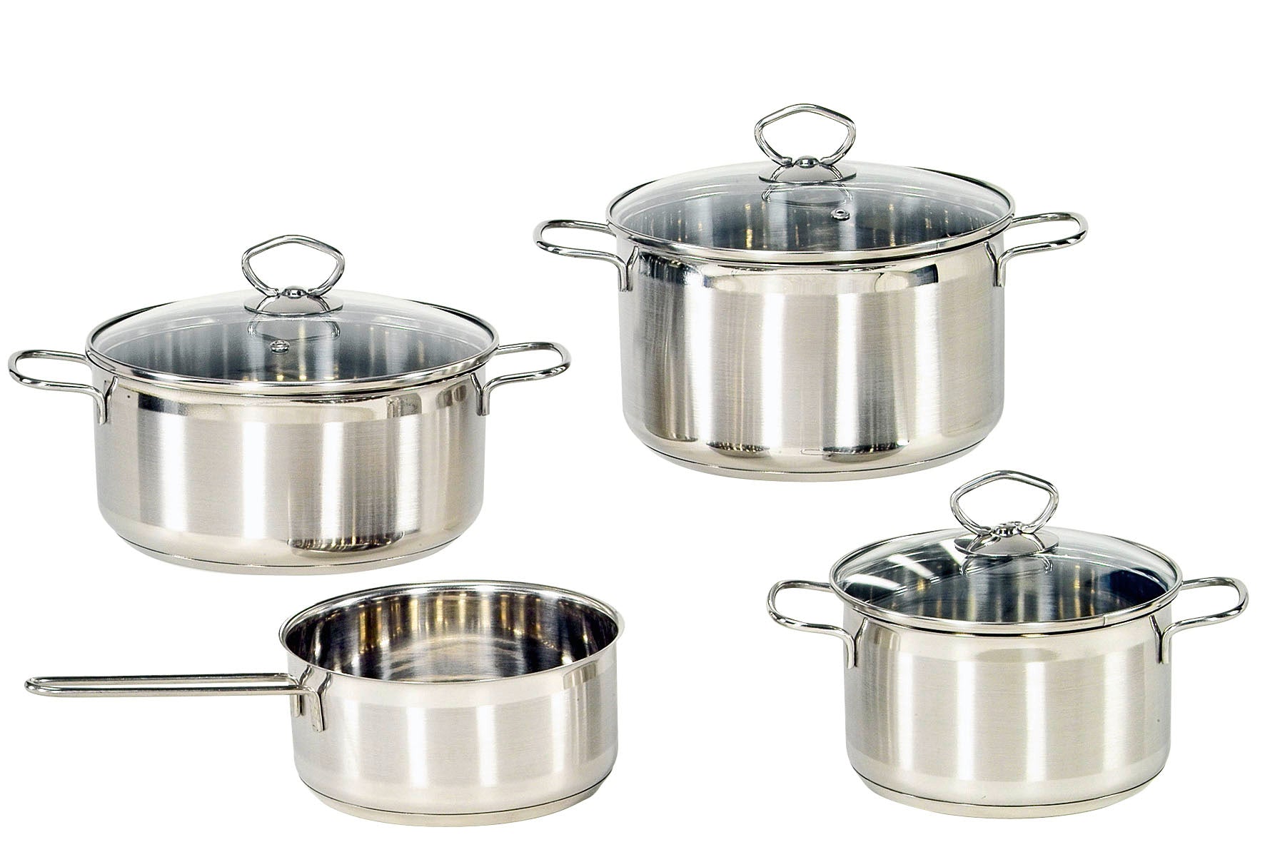 Edelstahl rostfrei, Inhalt: 1 x Bratentopf mit Glasdeckel Ø 20 cm 1,8 l, je 1 x Fleischtopf mit Glasdeckel Ø 16 cm 1,6 l, Ø 20 cm 2,8 l, 1 x Stieltopf ohne Glasdeckel Ø 16 cm 1,1 l, Wandstärke 0,5 mm, 3 mm Kapselboden, Töpfe mit satiniertem Dekorband und Edelstahlgriffe, für alle Herdarten inkl. Induktion geeignet, Glasdeckel mit Edelstahlschutzrand, Lüftungsloch und Edelstahlgriffen, im Farbkarton verpackt, spülmaschinenbeständig