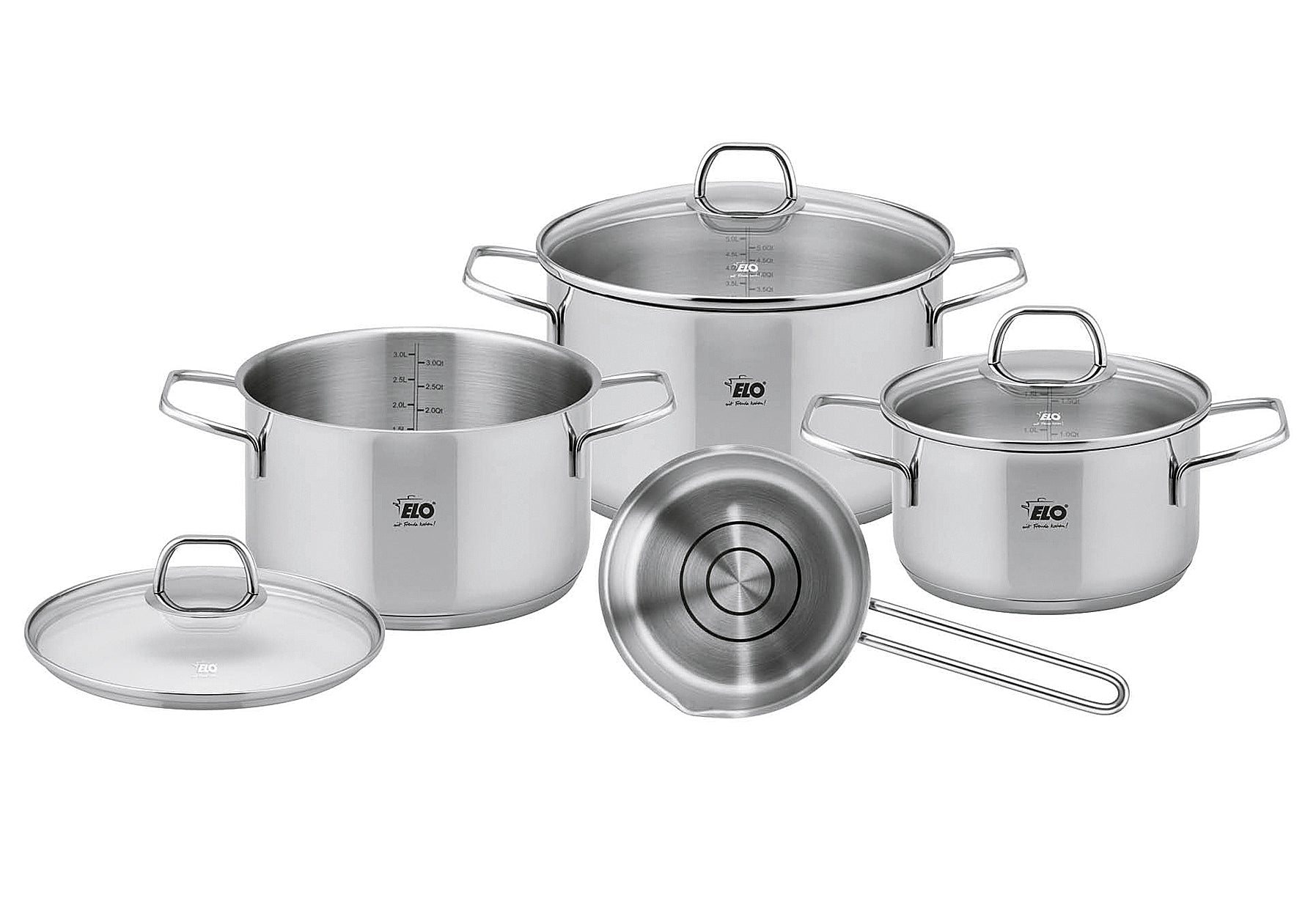 Edelstahl, Inhalt: je 1 x Fleischtopf mit Glasdeckel 1,7 l, Ø 16 cm und 3,3 l, Ø 20 cm, 5,7 l, Ø 24 cmund 1 x Stielkasserolle mit Ausguss 1,3 l, Ø 16 cm, Wandstärke ca. 0,6 mm, Bodenstärke Töpfe ca. 4,6 mm, energiesparender Kapselboden, innen satiniert mit Literskala und Öl-Dosiersystem, außen hochglanzpoliert mit ELO-Logo, Edelstahl Drahtgriffe, geschweißt, Glasdeckel mit stoßfestem EDS-Ring, EDS-Bügelgriff mit Fingerschutzplatte, spülmaschinengeeignet, backofenfest bis 240 °C ohne Deckel (mit Glasdeckel bis 180 °C), für alle Herdarten inkl. Induktion geeignet