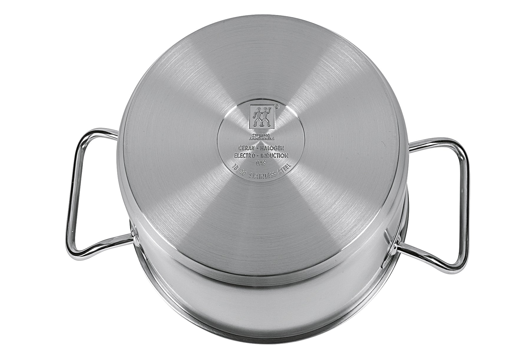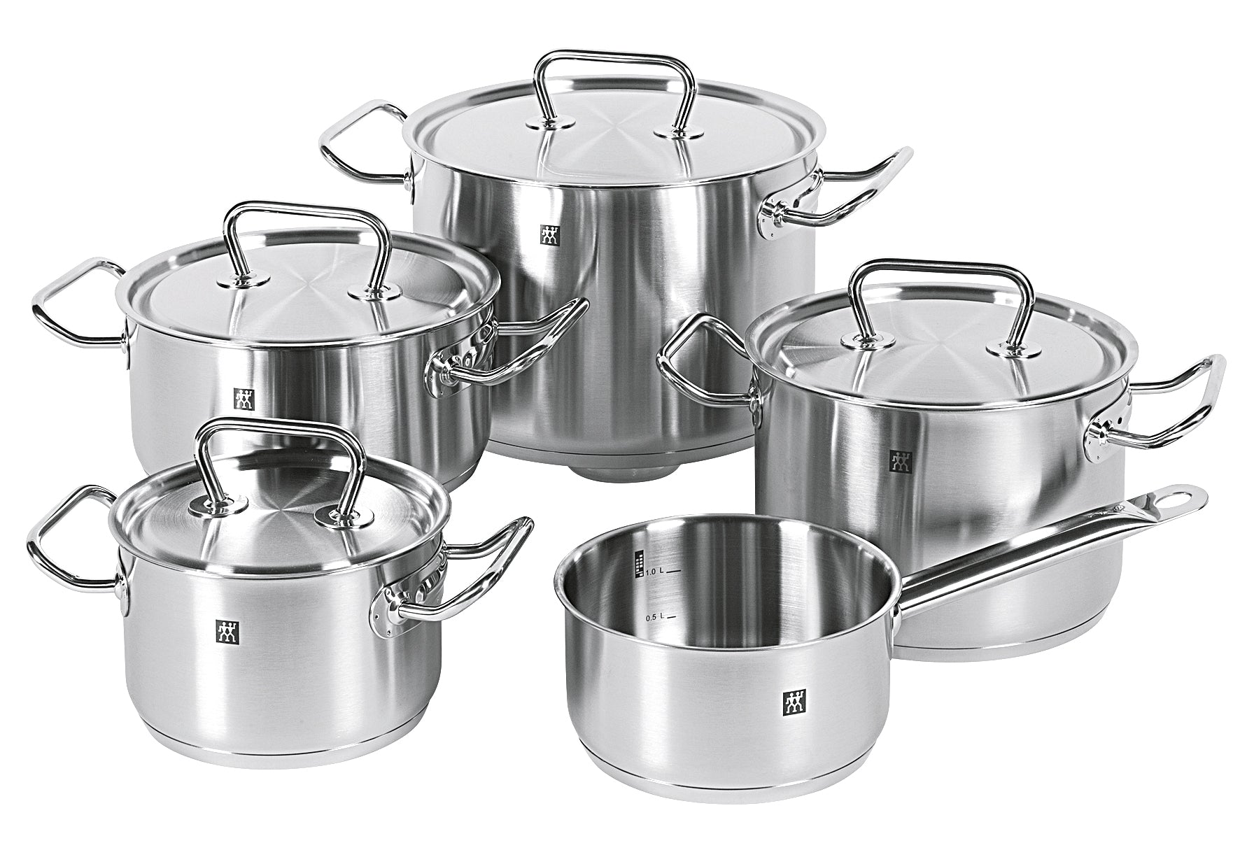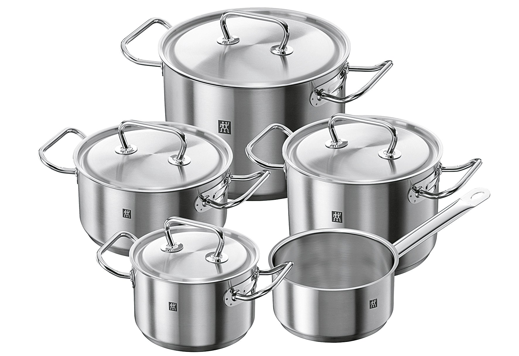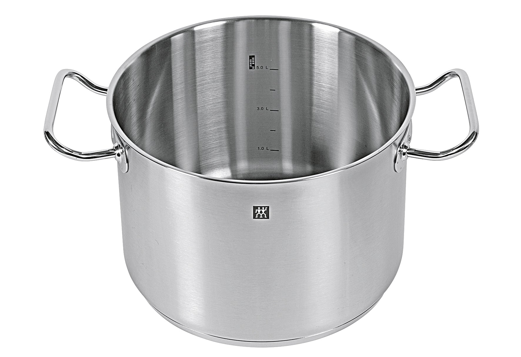 Edelstahl, Inhalt: je 1 x Kochtopf Ø 16 cm, Bratentopf Ø 20 cm, Stieltopf ohne Deckel Ø 16 cm, Kochtopf Ø 20 cm, Kochtopf Ø 24 cm, klares, traditionelles Design, edel mattiertes smooth satin finish, integrierte Füllskala, SIGMA Classic Boden mit einem Kern aus reinem Aluminium, ergonomische Griffe aus Edelstahl garantieren sicheres Handling und bleiben während des Kochvorgangs kühl, für alle Herdarten inkl. Induktion geeignet, backofengeeignet, spülmaschinengeeignet