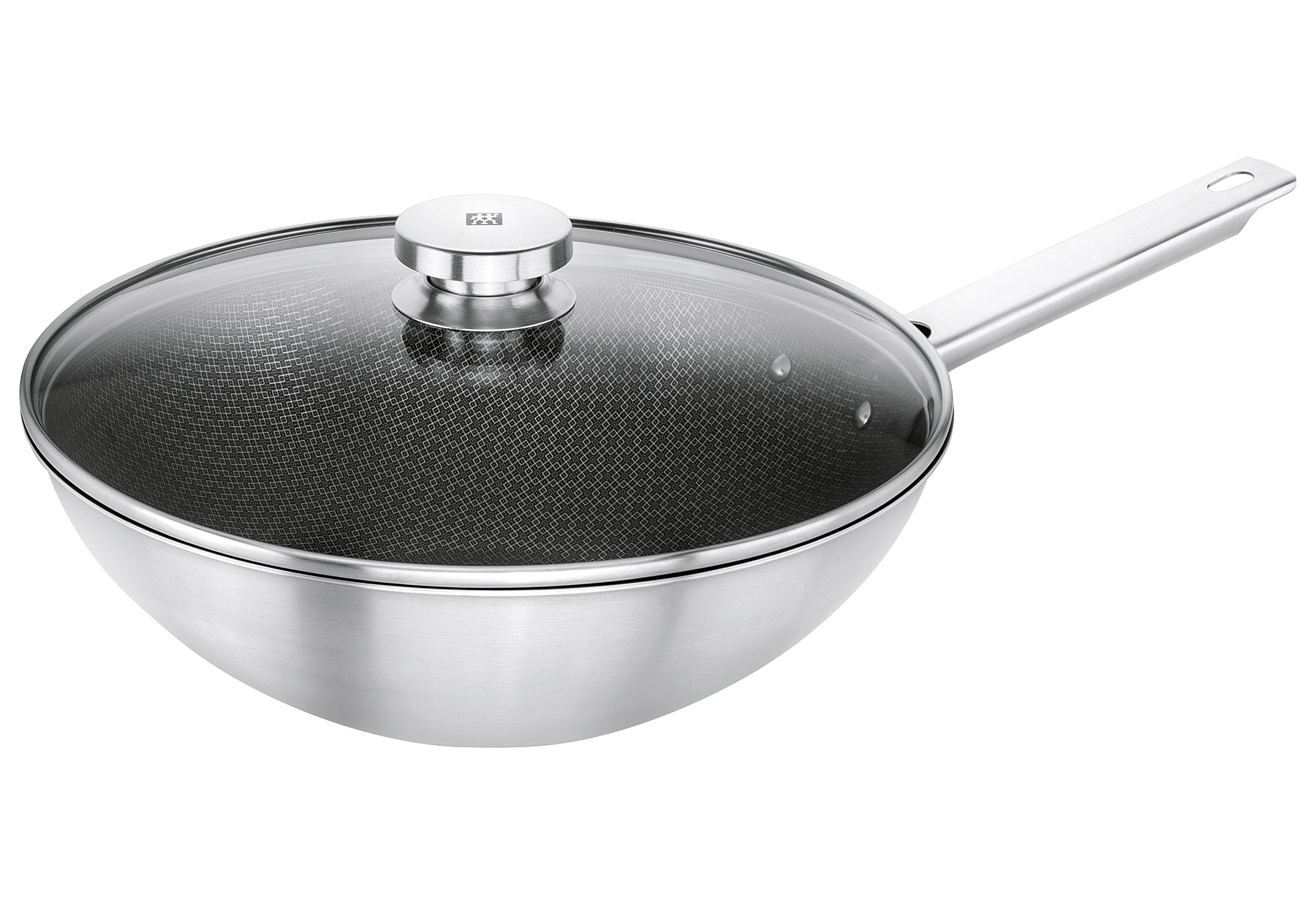 Edelstahl 18/10, Glas, extrem robuste 3-Schicht-Antihaftbeschichtung mit hochpräziser Mikrogravurtechnik, schnelle Wärmeleitfähigkeit dank der Sigma Clad3 Schichtkonstruktion, geeignet für alle Herdarten, Satin-finished Oberfläche, passgenauer Deckel, ergonomischer Stielgriff Ø 30 cm